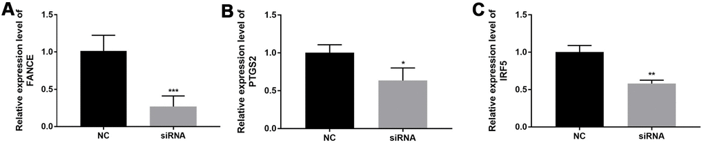 In order to verify relationship between FANCE expression and macrophages, OSCC line CAL-27 were transfected with FANCE siRNA. Compared to control OSCC cells, the marker gene of M1 macrophages (PTGS2 and IRF5) in FANCE depleted cells was significantly down-regulated (Figure 14).