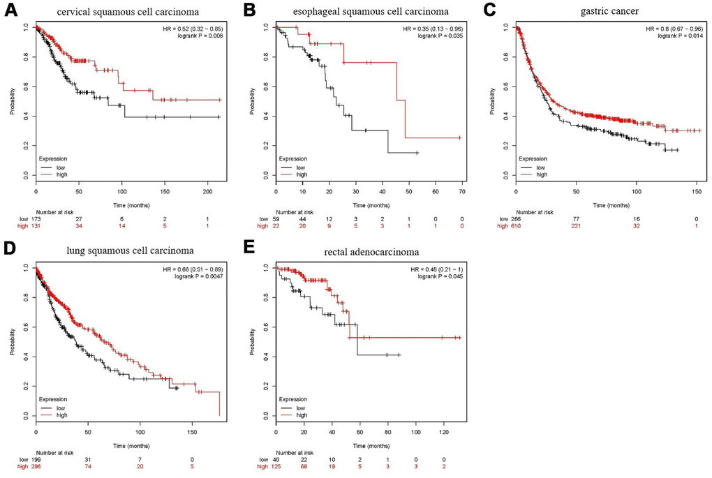 The Kaplan Meier plotter (KM plotter, http://kmplot.com/analysis/) is capable of assessing the effect of 54,000 genes on survival in 21 types of cancer [65]. The correlation between the hub gene expression and survivals of all 21 types of cancers were analyzed by Kaplan-Meier plotter. The hazard ratio (HR) with 95% confidence intervals (CI) and log-rank P value were also computed.
