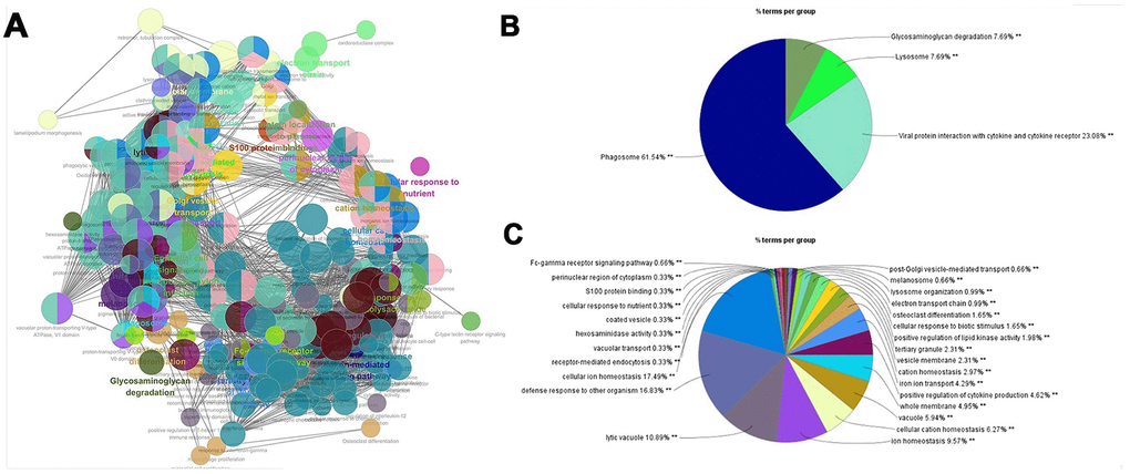 292 genes were imported into the STRING database to construct a PPI network. In total, 292 nodes and 893 edges were presented. The ClueGo plug-in of Cytoscape was used to further analyze the functionality of the gene set, as shown in Figure 2. The functions of macrophage signature gene set were concentrated in biological processes such as phagosome, lysosome, defense response, cell ion homeostasis, and lytic vacuole. These biological processes were closely related to the phagocytic function of macrophages.