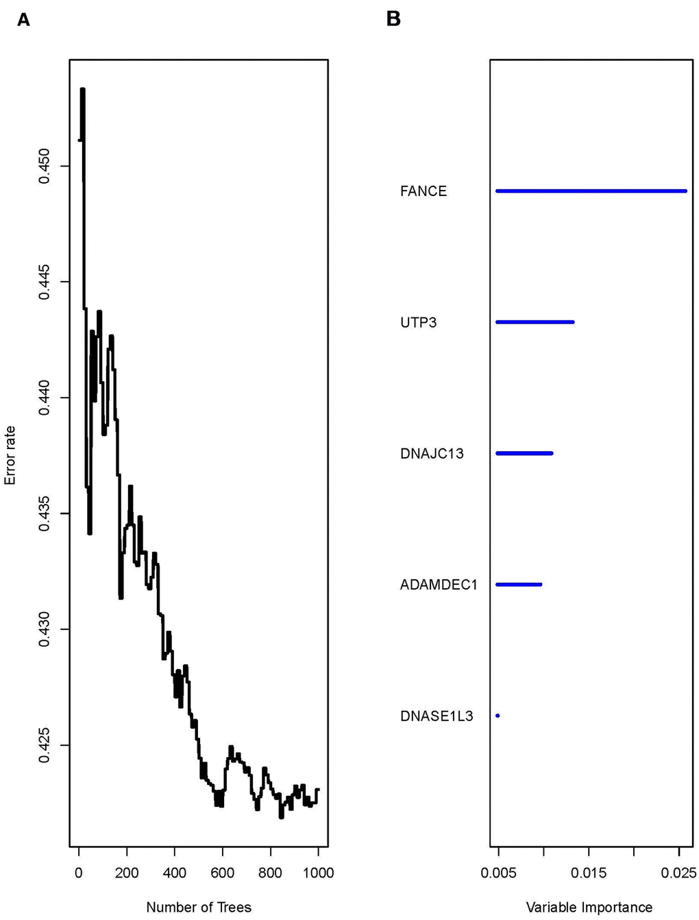 The genes screened out with significant prognosis were next included for randomForest feature selection using “RandomForest” package. Mtry is set to the square root of the maximum number of variables, and ntree is set to 1000 in the model. The minimum number of samples required to split a node was set to two. The minimum samples per leaf was set to one. A prognostic model was constructed by random forest algorithm to screen the genes which reached the standards (both Mean Decrease Gini and Mean Decrease Accuracy ranked top 5) were considered as candidate hub genes.