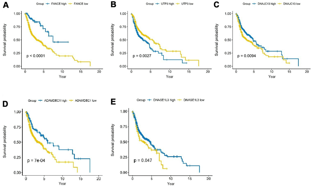 As shown in Figure 4, analysis of HNSC cases in TCGA showed that the expression differences of the five genes had a significant impact on the prognosis. Among them, the up-regulation of expression of FANCE, DNAJC13, ADAMDEC1 and DNASE1L3 was significantly positively associated with better 5-year survival rate, while increased expression of UTP3 was significantly correlated with a worse prognosis (all *P <0.05).