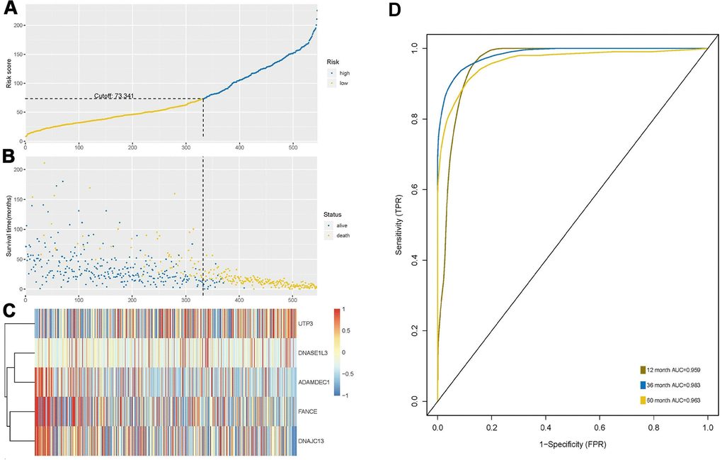 The risk score was calculated based on the expression levels and regression coefficients of the five target genes, and the best cutoff value was 73.341 (Figure 5A). Using this as a boundary, the high- and low-risk group can be well distinguished (Figure 5B, 5C). ROC curve showed predictive ability of the prognostic model with AUC of 1-, 3- and 5-years OS 0.959, 0.983 and 0.963, respectively (Figure 5D).