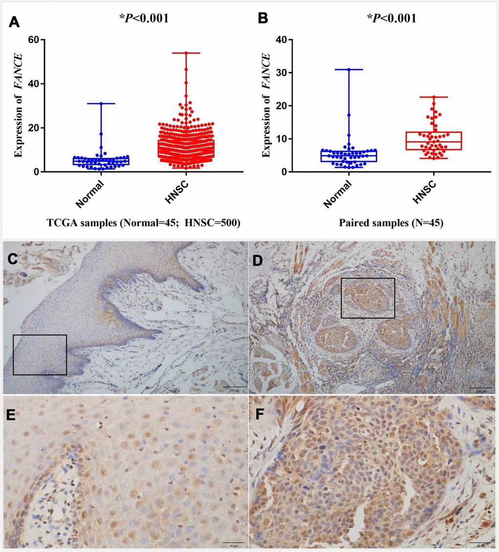 Oral squamous cell carcinoma (OSCC) specimens from 15 pathologically confirmed HNSC patients aged 45 to 87 were included in the study. Immunohistochemical staining of HNSC tissue specimens and adjacent normal tissues revealed that FANCE was strongly stained in tumor tissues (Figure 6D, 6F), but the staining intensity was lower in adjacent normal tissues (Figure 6C, 6E).