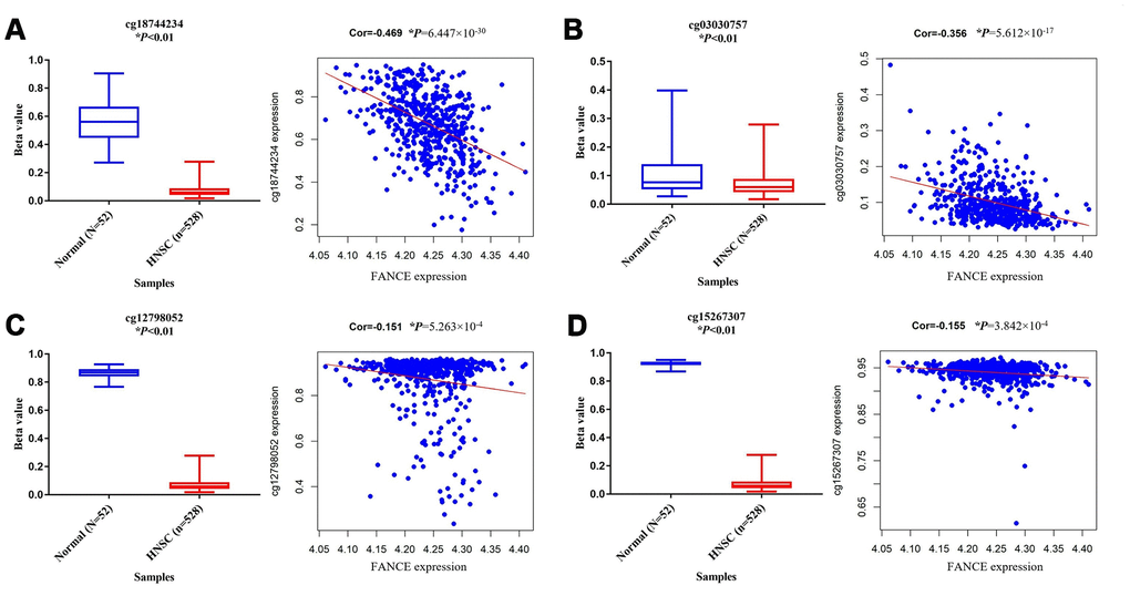 In order to explore the possible reasons for the up-regulation of FANCE in HNSC, the relationship between its methylation status and its expression was further analyzed. A total of 10 methylation sites were found in the FANCE gene. Among them, cg12798052 in the promoter region, cg03030757 and cg18744234 in the gene enhancement region, and cg15267307 in the transcription region were detected with significant hypermethylation (Figure 7). Additionally, they are also significantly negatively correlated with the expression of FANCE (all *P<0.05). We also observed that the hypermethylation status of cg09490277 was significantly positively correlated with the expression of FANCE, while no significant effect of methylation status at other five methylation sites on the expression of FANCE was observed. Relationship between methylation sites and expression of FANCE could be available from Supplementary Table 5.