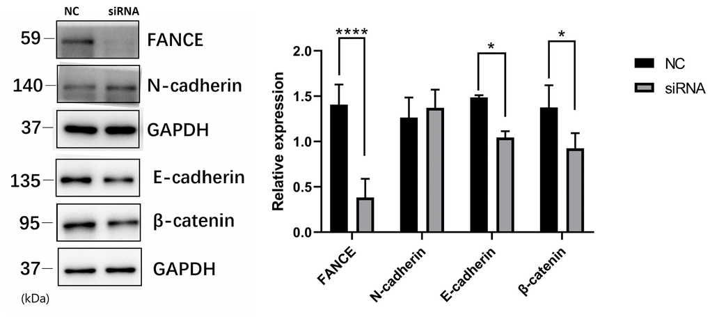 To investigate the molecular basis of FANCE regulation in OSCC cells, we examined the expression of several key proteins. Precious studies have shown that Wnt / β-catenin pathway is crucial for cell proliferation and apoptosis. Here, to evaluate the Wnt process, we suppressed FANCE expression and detected Wnt markers by performing Western blotting. As compared to control OSCC cells, FANCE depleted cells showed decreased expression of E-cadherin and β-catenin (Figure 9), which indicates that FANCE functions in the Wnt / β-catenin pathway process in OSCC cells. The results indicate that FANCE participates in the Wnt / β-catenin process and affects the expression levels of proteins that are crucial for cell cycle progression and apoptosis.
