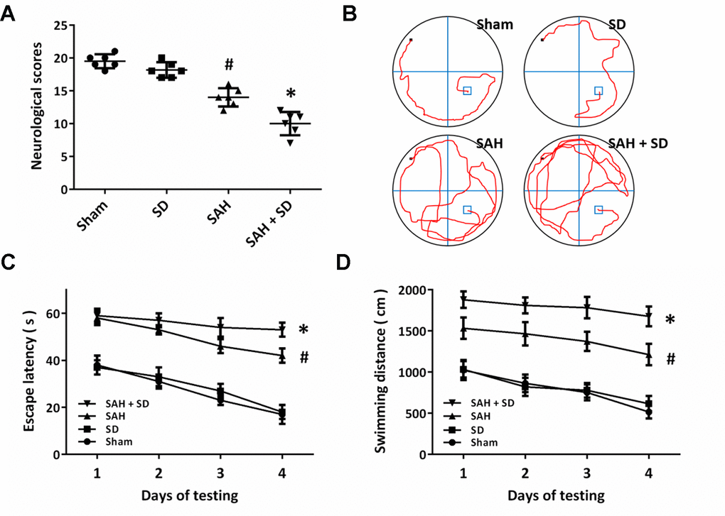 We used the composite Garcia neuro-score to determine the neurological impairment after SAH (Figure 2A). The obvious neurological dysfunction was observed in SAH-treated animals, whereas the neurological score in SAH + SD group was lower than that in SAH group. As shown in Figure 2B, the cognitive function was determined by the Morris water maze. Sleep deprivation aggravated the impairments in cognitive behavior as evidenced by the decreased escape latency (Figure 2C). Rats in SAH + SD group showed markedly longer swimming distance than that in SAH group (Figure 2D).