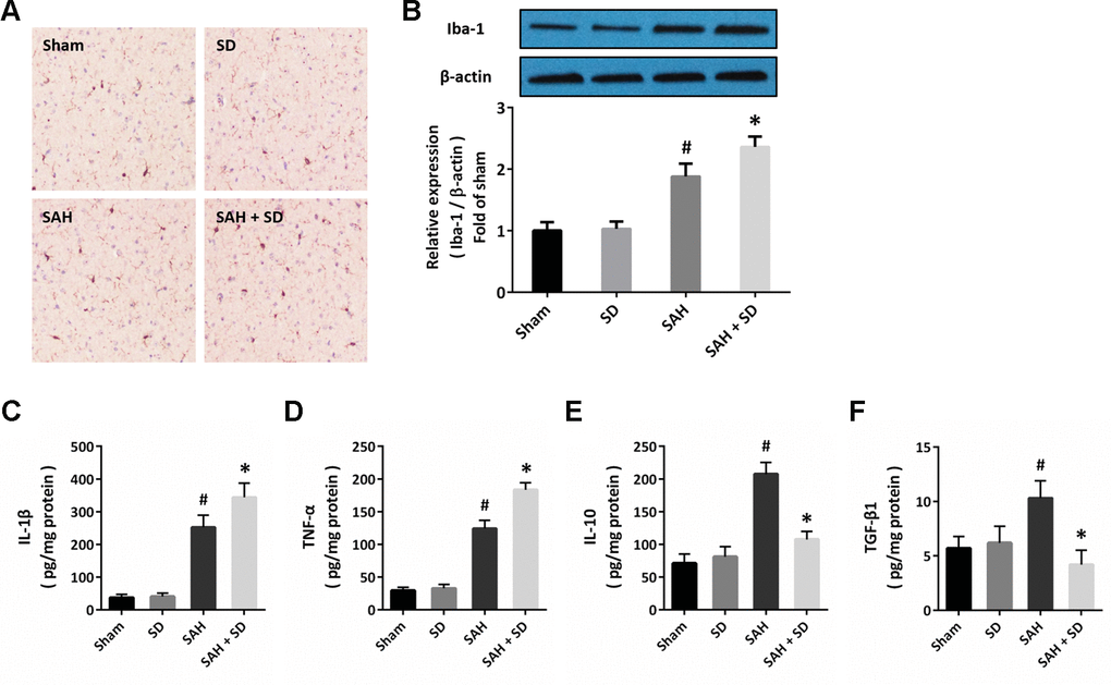 Next, we performed immunostaining using the Iba-1 antibody to detect the activation of microglial cells in brain section (Figure 3A). The number of Iba-1 positive cells was much higher in SAH + SD group than that in SAH group. In congruent, sleep deprivation significantly increased the expression of Iba-1 after SAH (Figure 2B). In addition, the ELISA assay was also performed to determine the expression of inflammatory cytokines. The results showed that sleep deprivation further increased the expression of IL-1β (Figure 3C) and TNF-α (Figure 3D), but decreased the expression of IL-10 (Figure 2E) and TGF-β1 (Figure 2F) after SAH.