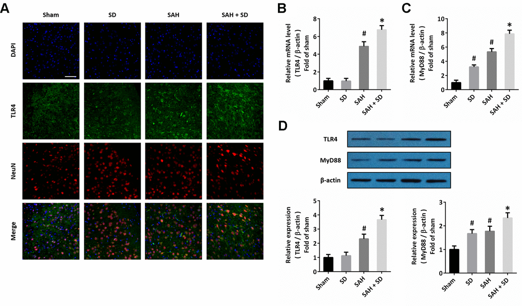 To investigate the possible molecular mechanism underlying our data, we performed immunofluorescence staining using the TLR4 antibody, and we found that sleep deprivation increased the expression of TLR4 after SAH, especially in neurons (Figure 4A). The results of RT-PCR showed that sleep deprivation significantly increased the mRNA levels of both TLR4 (Figure 4B) and MyD88 (Figure 4C) after SAH. As shown in Figure 4D, the increased expression of TLR4 and MyD88 protein induced by SAH was further enhanced by sleep deprivation.