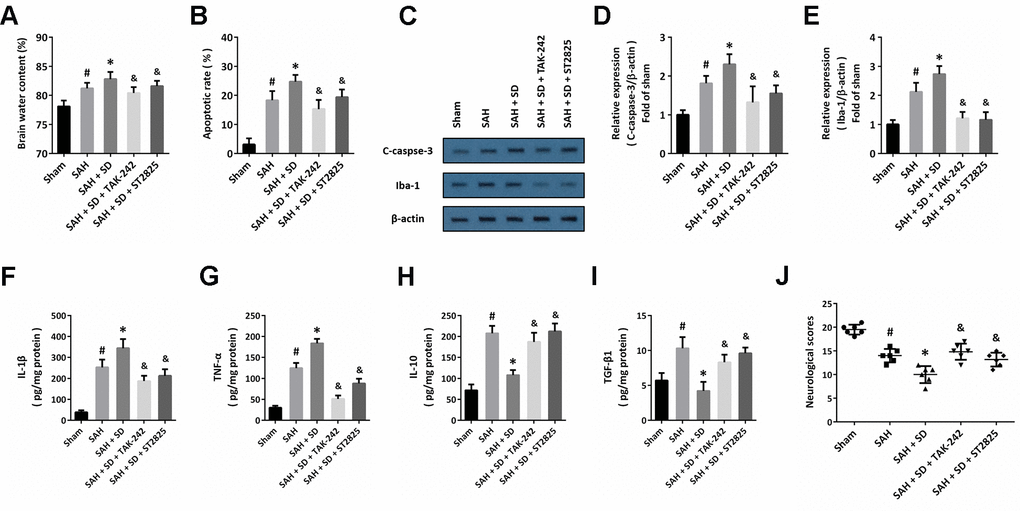 To further confirm the involvement of the TLR4-MyD88 pathway, animals were treated with TAK-242 or ST2825 to block the activation of TLR4 or MyD88, respectively. The data showed that the sleep deprivation-induced aggravation of brain injury, as evidenced by increased brain water content (Figure 5A), apoptosis (Figure 5B) and activation of caspase-3 (Figure 5C, 5D), were significantly attenuated by TAK-242 or ST2825. In addition, the increased activation of Iba-1 (Figure 5C–5E), increased levels of IL-1β (Figure 5F) and TNF-α (Figure 5G), as well as the decreased levels of IL-10 (Figure 5H) and TGF-β1 (Figure 5I) induced by SAH and sleep deprivation were all markedly reversed by TAK-242 or ST2825. As shown in Figure 5J, a similar result on neurological score was also observed.