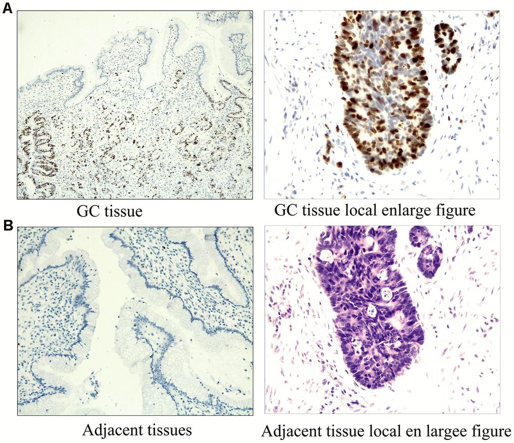 GC and adjacent tissues were collected from 50 patients diagnosed in Jiangsu Cancer Hospital from 2017 to 2019. The samples were immediately fixed in 10% formalin solution for 14 h. Then, paraffin embedment was performed for further immunohistochemical study. Pathological stage was determined on the basis of Fuhrman nuclear grade. Tumor stage was determined in accordance with the TNM classification of the American Joint Committee on Cancer. Prognosis assay was performed to follow-up with survivors and estimate the overall survival (OS) rate. OS was calculated from the date of surgery to the date of death or the latest follow-up. The present study was approved by the Ethics Committee of Jiangsu Cancer Hospital. All the participants provided a signed informed written consent in advance.