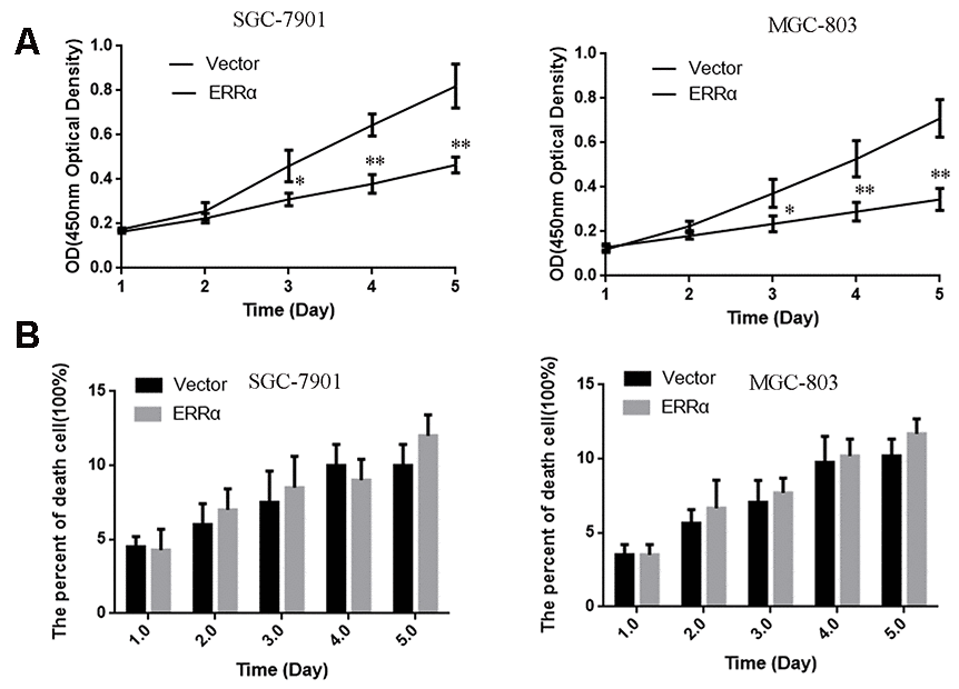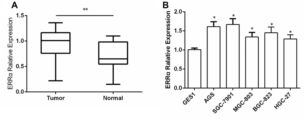 In the present work, we collected specimens from patients with GC and determined the expression of ERRα via tissue array. We also designed an ERRα low-expression vector and downregulated the expression of ERRα in SGC-7901 and MGC-803 cell lines to verify the functions of ERRα.