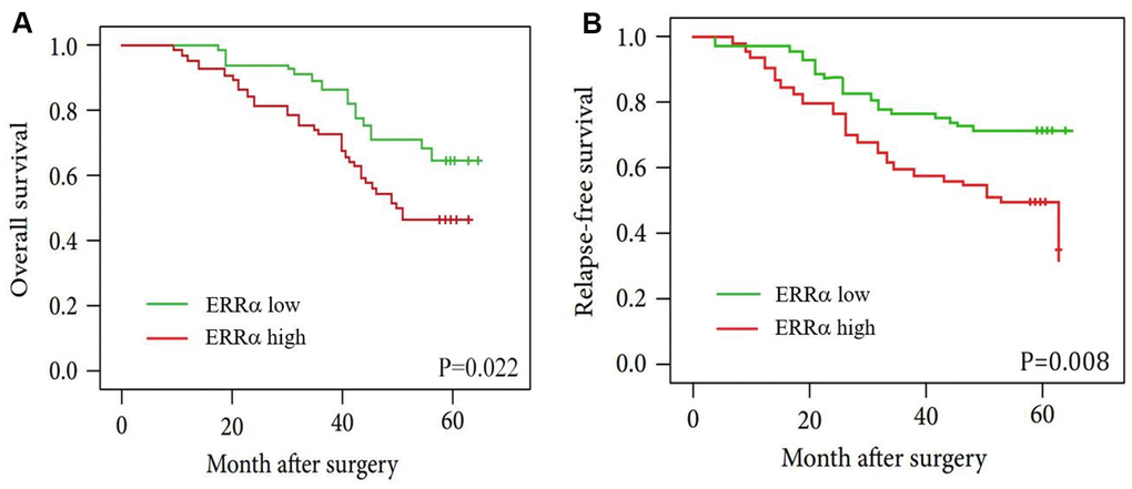 To study the clinical significance of ERRα in GC, we analysed the clinical relationship between the expression of ERRα in patients with GC and clinicopathological characteristics. The results showed that a high expression of ERRα was associated with advanced TNM stage (Table 1, P=0.002). Furthermore, the Kaplan–Meier analysis indicated that patients with high ERRα expression exhibited a decrease in OS (Figure 3A, P=0.022) and relapse-free survival (Figure 3B, P=0.022). The multivariate analysis results showed that a high expression of ERRα was a significant independent prognostic factor for OS in patients with GC (Table 2, P=0.024).