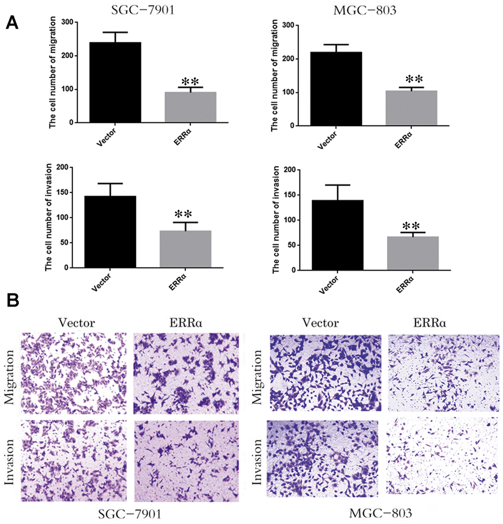 In this study, we found that the expression level of ERRα tends to be higher in GC tissues. The expression level of ERRα is significantly correlated with TNM staging and the survival rate of patients. In general, a high expression of ERRα is correlated with poor prognosis in patients with GC. The results of the assays performed n SGC-7901 and MGC-803 cells proved that the low expression of ERRα suppressed the capacity for cell migration and invasion and regulates the EMT signaling pathway.