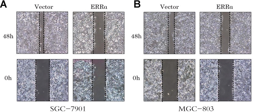 We also performed cell wound scratch assay. The wound was recorded at 0, 24 and 48h after it was generated. The downregulation of ERRα can weaken cell migration significantly in SGC-7901 and MGC-803 cells, particularly MGC-803 cells (Figure 6A, 6B).