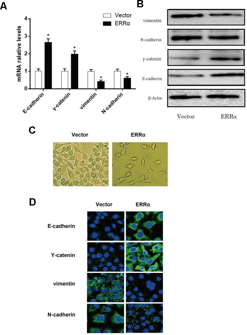 To verify the mechanism of ERRα in regulating cell migration and invasion, qPCR and Western blot analysis were conducted to determine the mRNA and protein levels of E-cadherin, γ-catenin, N-cadherin and vimentin, which are involved in the epithelial–mesenchymal transition (EMT) signaling pathway. The results showed that the mRNA and protein levels of E-cadherin and γ-catenin were increased, while the levels of vimentin and N-cadherin decreased in both cell lines (Figure 7A, 7B), indicating that the EMT signaling pathway was inhibited and potentially improved cell migration and invasion when ERRα had a low expression. To further illustrate the EMT stage cells, we performed immunofluorescence staining to more closely observe the cell morphology and differentiation occurred during EMT. As shown in Figure 7C, the cell density of cells with ERRα downregulated is lower than control. The immunofluorescence staining of cells presents consistent result with western blot, and the cells in control group looks less edged.
