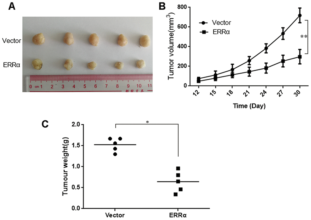 To assess the antitumor activity of ERRα in vivo, MGC-803 cells (shERRα and vector) were subcutaneously inoculated into BALB/c nude mice and tumor growth was monitored. As shown in Figure 8A, 8B, the knockdown of ERRα can significantly inhibit tumor growth compared with the vector. The knockdown of ERRα significantly decreased tumor volume and weight (Figure 8B, 8C, P<0.05; Figure 5B, P<0.05). Overall, these findings indicated that knocking down ERRα can suppress GC cell growth in vivo.