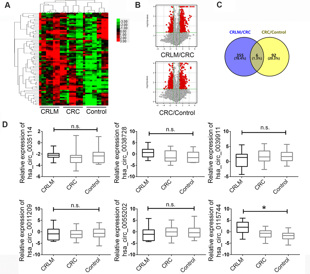 The circRNA microarray was used to detect the circRNA expression landscape in plasma samples of 10 newly diagnosed patients with CRC with liver metastasis (CRLM group), matched plasma samples of 10 patients with CRC without liver metastasis (CRC group), and plasma samples of 10 normal individuals as the control group. Clustering analysis with a heat map showed different expression profiles of these three groups (Figure 1A). A paired comparison was used to analyze statistically significant circRNAs in the CRLM group. Patients with CRC were compared with healthy controls by using volcano plots with the following parameters: fold changes ≥2.0 and p-value ≤ 0.05. As shown in Figure 1B, the results indicated a remarkably different expression landscape of circRNAs in the three groups. Next, we analyzed the upregulated circRNAs in the CRLM group compared to that in the CRC group and the increased circRNAs in CRC group comparing with healthy controls. The Venny map indicated that among the dysregulated circRNAs, six circRNAs showed a rapid increase in their expression level in plasma samples of the control, CRC, and CRLM groups (Figure 1C).