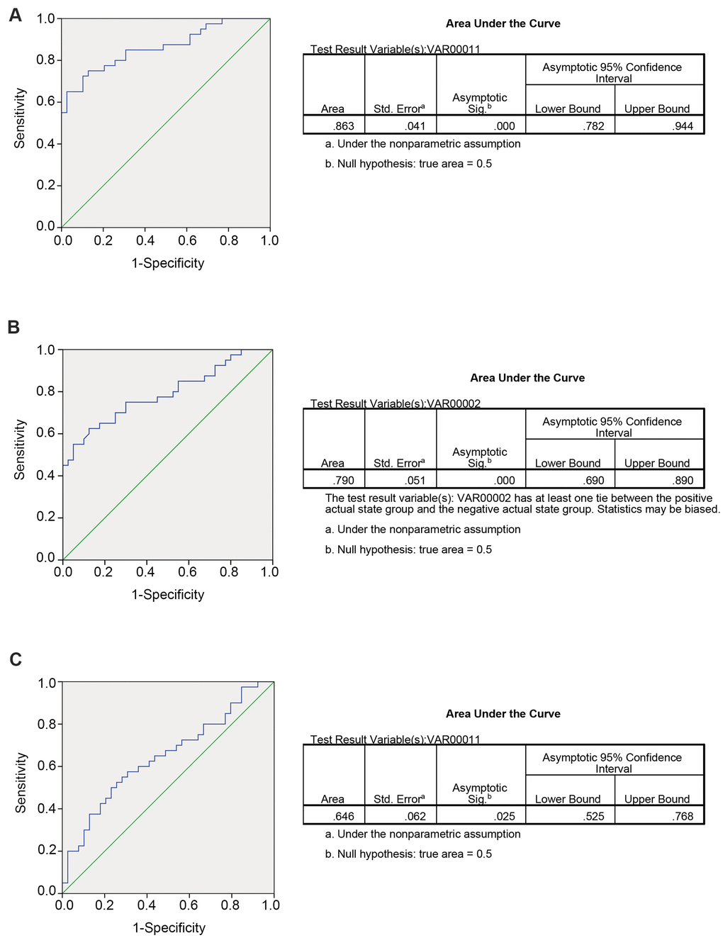 We performed the risk score analysis to determine the predictive ability of the candidate plasma circRNA. In brief, the upper 95% reference interval (95% CI) of each circRNA value in the control group was used as the cutoff value for the expression level of certain circRNAs. If the expression of circRNA in this sample was higher than the 95% CI value, we assigned as 1, and if lower than the 95% CI value, we assigned as 0. The risk score function (RSF) to predict the CRLM group was defined according to a linear combination of the expression level of each circRNA. For example, the RSF for sample i using information from three circRNAs was given as follows: rsfi=Σ3j-1Wj.sij. In this equation, sij is the risk score for circRNA j on sample i, and Wj is the weight of the risk score of circRNA j. The risk scores of the three circRNAs were calculated using the weight by the regression coefficient derived from the univariate logistic regression analysis of each circRNA. The samples were ranked according to their RSF and then divided into a high-risk group that represented patients with CRLM and a low-risk group that represented the predicted control individuals. Frequency tables and receiver operating characteristic (ROC) curves were then used to evaluate the diagnostic effects of the profiling and to find the appropriate cutoff value, and then to validate the procedure and cutoff values in the next validation sample set.