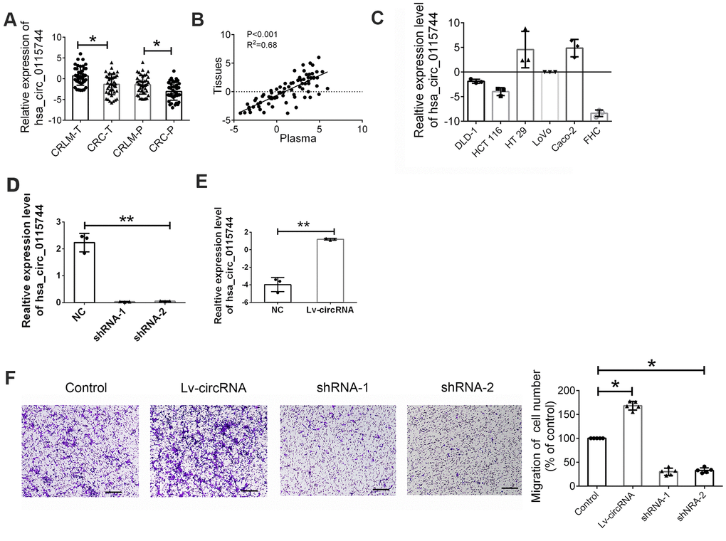 As the function of circ_0115744 is unclear in human cancers, we next detected whether circ_0115744 was abnormally expressed in the tissues samples of patients. with CRLM or corrected with circulating expression Among the 200 patients with CRLM and CRC, 40 patients received resection for CRC and synchronous liver metastasis node. Furthermore, randomly selected 40 CRC patients who also received resection for CRC but were without liver metastasis were also enrolled. First, we analyzed the expression of circ_0115744 in tumor tissues and the corresponding adjacent tissues. As shown in Figure 3A, we found that circ_0115744 expression was increased in tumor tissues of both the CRLM and CRC groups. On the basis of the clinicopathological characteristics of the enrolled patients, it was found that circ_0115744 was highly associated with liver metastasis (Table 3). A positive correlation of circ_0115744 expression was also observed in tissues samples when compared with the matched plasma samples (Figure 3B). Next, we conducted the loss- and gain-of-function assay to detect the endogenous expression of the circRNA circ_0115744 in CRC cell lines. DLD1 was selected as the cell model based on the medium expression level (Figure 3C). Next, DLD1 was treated with a circ_0115744-overexpressing lentivirus vector and two independent shRNA lentivirus vectors. The infection efficiency was measured by RT-PCR (Figure 3D, 3E). The Transwell assay was conducted to measure the function. The results showed that increased circ_0115744 expression promoted invasion of CRC cells, while decreased circ_0115744 expression suppressed cell invasion (Figure 3F); this finding indicated that circ_0115744 was highly associated with CRC metastasis.
