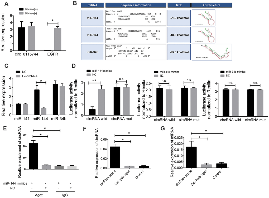 As there are few reports on the detailed mechanism of circ_0115744 in human cells, we next determined whether circ_0115744 could be digested by RNase R. By using EGFR as a control, we found that circ_0115744, instead of EGFR, can resist digestion by RNase R (Figure 4A). Given that circRNAs may act as competing endogenous RNAs (ceRNAs) of miRNAs to regulate mRNA expression, we next assessed the potential targets of circ_0115744 through a ceRNA-dependent mechanism. Furthermore, by using the bioinformatics tool Miranda, we predicted and screened the top three possible sponge miRNAs, including miR-141, miR-144, and miR-34b (Figure 4B). The subsequent qRT-PCR analysis showed that the upregulation of circ_0115744 decreased the expression of only miR-144 but not of miR-141 or miR-34b (Figure 4C). Next, the dual luciferase reporter assay was conducted to determine whether circ_0115744 could directly bind to the miRNA candidate. As shown in Figure 4D, we found that only the luciferase intensity of miR-144 was significantly suppressed. The RIP analysis also showed that more circ_0115744 was pulled down by anti-Ago2 antibody when transfected with miR-144 mimics in DLD-1 cells as compared to the miR-144 control group and the IgG group (Figure 4E). A biotin-coupled circ_0115744 probe was also designed for the pull-down assay, and the results showed that miR-144 was effectively enriched by circ_0115744 (Figure 4F).