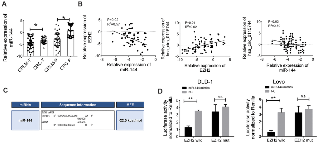 To further elucidate the regulatory relationship between circ_0115744 and miR-144, the expression levels of miR-144 in the tissues samples of patients with CRLM and CRC were also determined. We found that miR-144 expression was downregulated in tumor tissues of both the CRLM and CRC groups (Figure 5A). miR-144 has been identified as a tumor suppressor in CRC, and many studies have reported that EZH2 is the main target gene of miR-144 [15, 16]. Therefore, we speculated that circ_0115744 may regulate the metastatic process through the miR-144/EZH2 pathway. Pearson’s correlation analysis was also used to confirm this finding. The results showed an inverse correlation between EZH2 and miR-144, a positive correlation between circ_0115744 and EZH2, and an inverse correlation between miR-144 and circ_0115744 (Figure 5B). The detailed binding site for miR-144 on EZH2 was also predicted (Figure 5C). A subsequent dual luciferase reporter assay indicated that miR-144 could directly bind to EZH2 (Figure 5D).