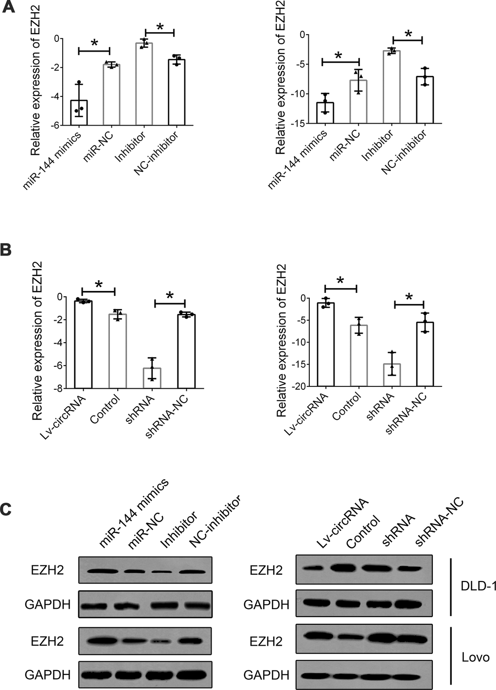 We further investigated the interaction between circ_0115744, miR-144, and EZH2. First, we detected the expression of EZH2 in cells treated with miR-144 mimics and an miR-144 inhibitor. The expression of EZH2 was suppressed following miR-144 overexpression, while EZH2 expression was upregulated through the inhibition of miR-144 (Figure 6A). Furthermore, the increased level of circ_0115744 also promoted the expression of EZH2, while the suppression of circ_0115744 expression downregulated EZH2 expression (Figure 6B). The protein level of EZH2 was also confirmed to be consistent with its mRNA level mentioned above (Figure 6C).