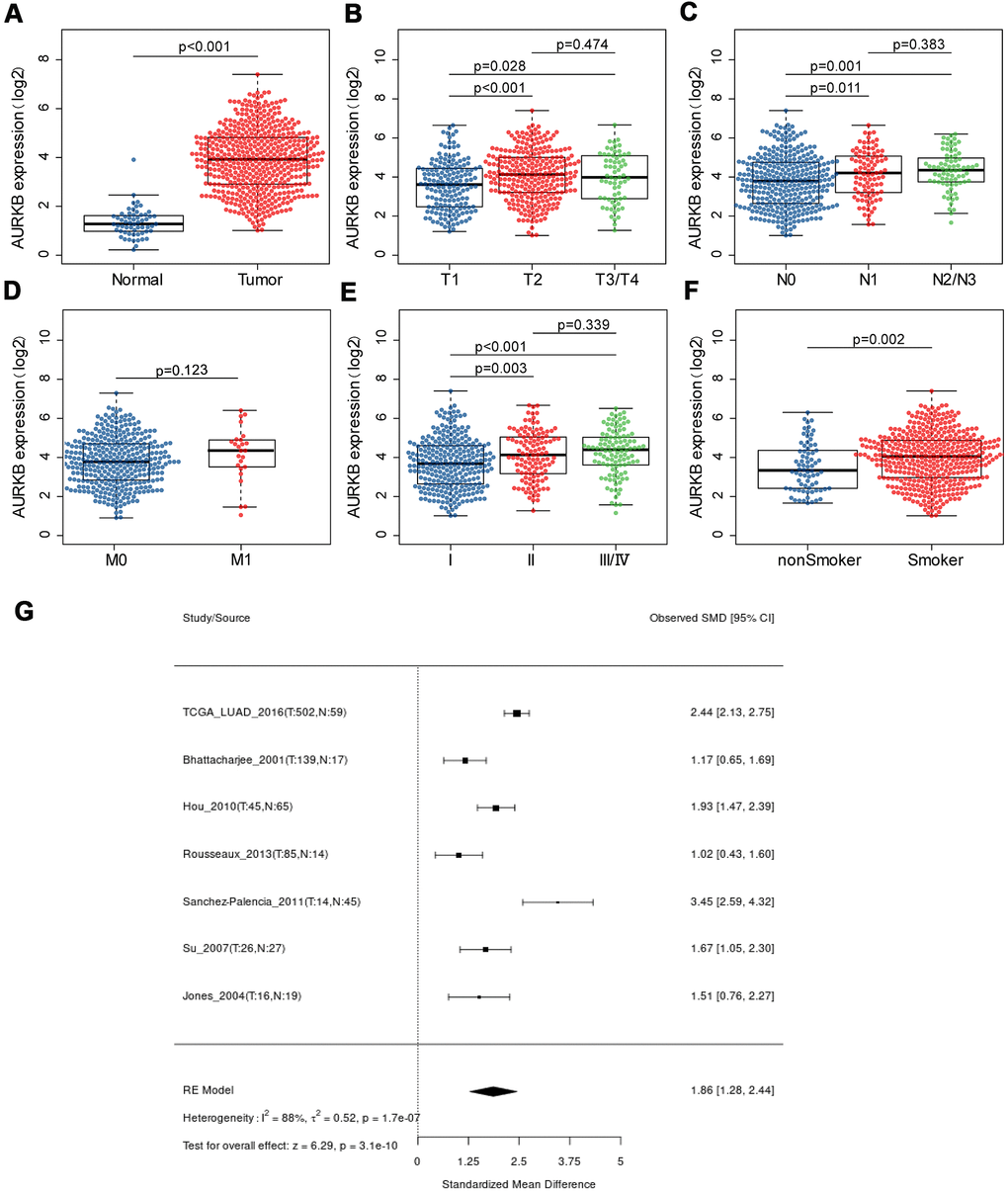 TCGA-LUAD cohort was used to compare the expression of AURKB in lung adenocarcinoma patients. As shown in Figure 1A, AURKB was overexpressed in LUAD tumor tissues (513 cases) when compared with 59 normal tissues (rank-sum test, p < 0.001). We further examined the correlation between AURKB expression and the clinical features of the 513 lung adenocarcinoma patients. For TNM system, we found that AURKB was significantly low-expressed in tumors with smaller size (T1 stage) when compared with T2 (p<0.001) or T3-4 (p=0.028) (Figure 1B). Patients without lymph node invasion (N0) showed low expression of AURKB than those with N1 (p=0.011) or N2-3 (p=0.001) (Figure 1C). No significant differences among patients with or without metastasis (p=0.123, Figure 1D) were detected, which might be due to the limited number of metastatic patients in the LUAD cohort. However, AURKB showed obvious variations in the patients’ staging: lower expression in stage I against stage II (p=0.003) or III/IV (p<0.001), as shown in Figure 1E. We also found that AURKB was noticeably high-expressed in patients with a history of smoking (p=0.002, Figure 1F), and that elder or female patients tend to have a relatively lower expression of AURKB (p=0.041, 0.0028, respectively, as shown in Table 1). We additionally compared 7 microarrays and sequencing data sets using the lung cancer explorer (LCE) database, and the results confirmed that AURKB expression was up-regulated in lung adenocarcinoma (p=3.1e-10, Figure 1G).