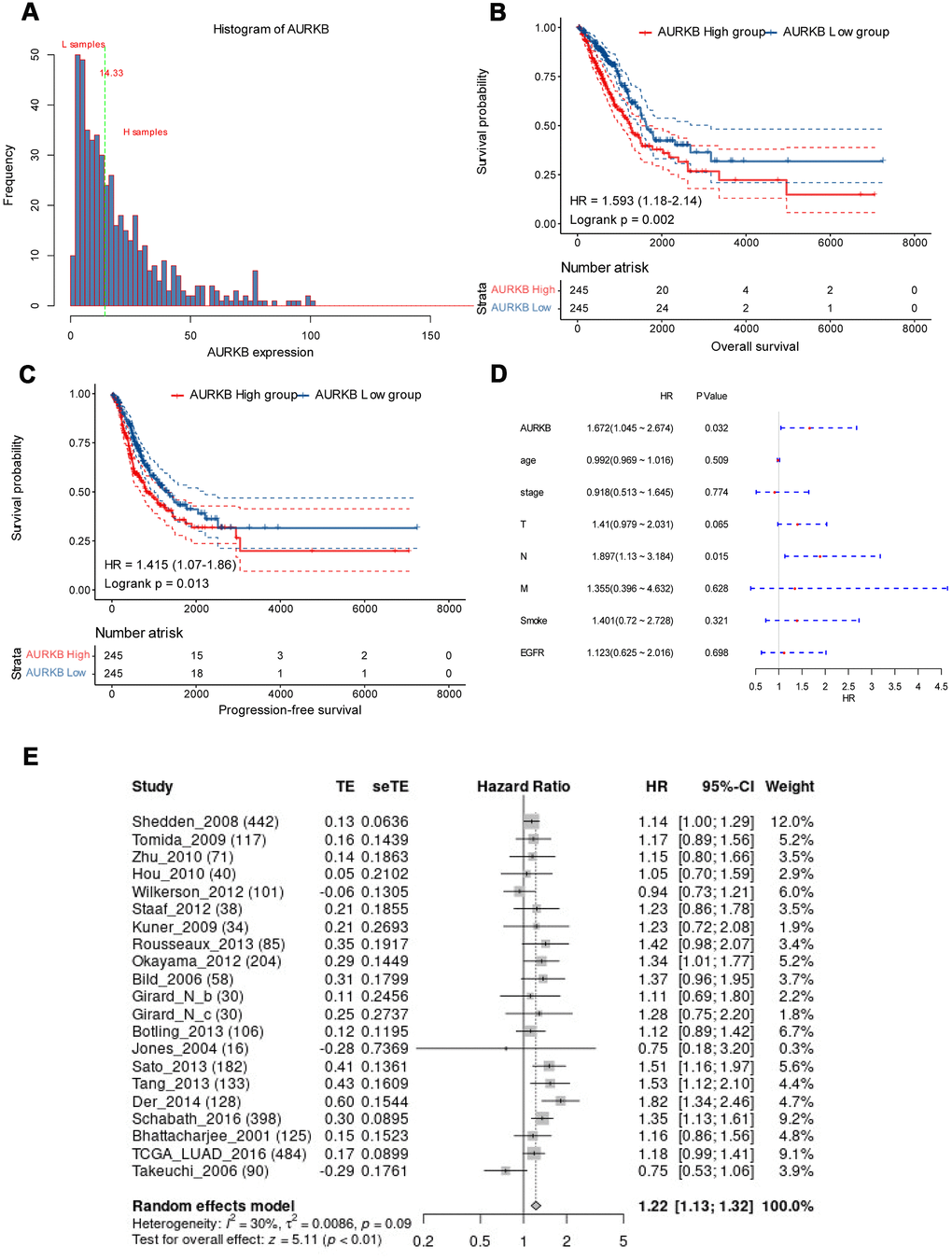 As AURKB is high-expressed in lung adenocarcinoma tissues and correlates with more advanced tumor stage, we hypothesized that AURKB might be a prognostic factor in LUAD. Thus, the expression distribution of AURKB and prognosis of each sample were examined. We observed that the expression of AURKB of each individual was (Figure 2A) concentrated, with a median value of 14.33. Based on this, lung adenocarcinoma patients were then divided into AURKBhigh and AURKBlow groups, with 245 samples each group. As shown in Figure 2B, 2C, higher expression of AURKB contributed to significantly worse overall survival (OS, p=0.002) and progression-free survival (PFS, p=0.013), indicating that AURKB is associated with poor prognosis in patients with lung adenocarcinoma. The data of multivariate cox analysis also showed that AURKB and N staging could be two independent prognostic factors of LUAD (HR, 95%CI: 1.672, 1.045-2.674 for AURKB, 1.897, 1.13-3.184 for N staging, Figure 2D), irrespective of T stage, M stage, smoking history and EGFR mutation status. The outcome data of 21 data sets involving 2912 patients with LUAD further confirmed that AURKB could be a prognostic factor in LUAD (HR, 95%CI: 1.22, 1.13-1.32, Figure 2E).