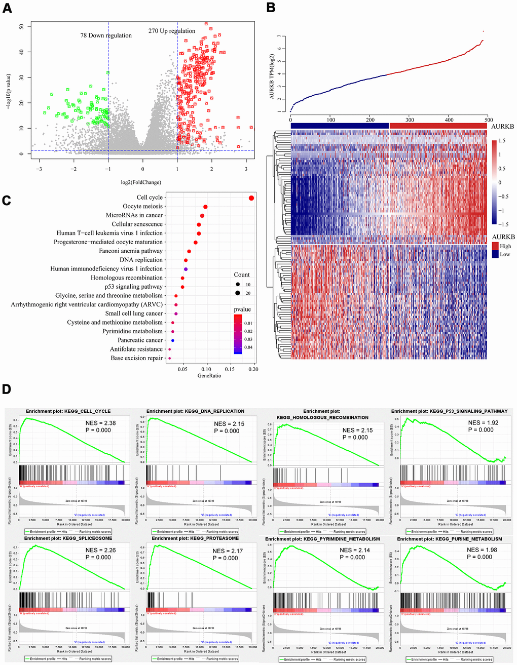 To identify the key genes involved in the AURKB-mediated poor survival of LUAD and related biological functions or pathways, we compared the expressions of differentially expressed genes (DEGs) between AURKBhigh group and AURKBlow group and examined their correlations with AURKB using the T-test and the rank-sum test, respectively (mRNAs were excluded if over 50% values are empty or zero). Only genes with correlation coefficients larger than 0.3, fold change >2, and the p-value < 0.01 either in the T-test or the rank-sum test were considered as DEGs. As visualized by volcano plot and heatmap (Figure 3A, 3B), 348 DEGs incorporating 270 upregulated genes and 78 downregulated genes were found. The top 10 upregulated and down-regulated genes identified by fold changes were listed in Table 2. The most correlated mRNA with AURKB was FAM64A, which is a marker of cell proliferation, and has been found to be associated with the aggressive growth of pancreatic cancer and breast cancer [16, 17]. Moreover, study indicated that FAM64A may also regulate Th17 cells and promote inflammation-associated cancers [18]. PRAME, an antigen high-expressed in various types of cancers, is involved in cell apoptosis, differentiation, proliferation, and metastasis [19], and it had the greatest fold change in the two groups. CDCA3 is the most significantly differentiated mRNA, and is already proven to be a prognostic factor in NSCLC patients [20]. Additionally, we further used ClusterProfiler [21] R-package to run KEGG enrichment analysis, and found that DEGs were enriched in 19 pathways (p<0.05), especially in cancer-related pathways including cell cycle, DNA replication, homologous recombination, and p53 signaling pathway (Figure 3C). These pathways were additionally validated by KEGG pathway enrichment analysis using GSEA. Meanwhile, we found some other pathways (24 pathways in total), such as purine metabolism, pyrimidine metabolism, spliceosome, and proteasome, were related to high expression of AURKB (Figure 3D). Since AURKB could mediate EGFR TKI resistance as above-mentioned, we also analyzed the relationship between 19 pathways and EGFR pathway by calculating the score of each patient in these pathways using ssGSEA. The results demonstrated that most of the 19 pathways were significant correlated with the EGFR pathway (89.5%) (Supplementary Figure 2A). However, for the AURKBlow group, no pathways met our criteria that both p-value and FDR q-value should be less than 0.05. Aberrant DEGs and enriched pathways identified in this study were closely associated with cancer formation and therapy resistance, which was consistent with our previous finding that AURKB mediated poor outcome for LUAD patients and might explain for the internal mechanism of action.