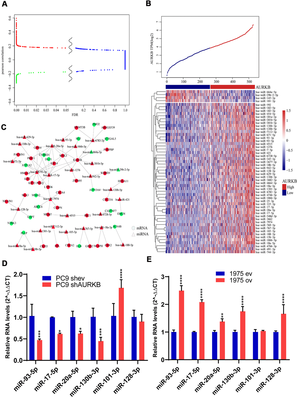 To further validate the association of identified miRNAs with AURKB in vitro, we tested the protein expression levels of AURKB among 4 lung adenocarcinoma cell lines, including A549, H1299, PC9 and H1975 (Supplementary Figure 3A). Lentiviral shRNA-mediated ARUKB inhibition in AURKB high-expressed PC9 cells and lentiviral AURKB-mediated overexpression in AURKB low-expressed H1975 cells were confirmed by western blotting and quantitative PCR (Supplementary Figure 3B, 3C). Knockdown of AURKB in PC9 cells significantly downregulated the expressions of miR-93-5p, miR-17-5p, miR-20a-5p, miR-130b-3p and upregulated the expressions of miR-101-3p (Figure 4D). While overexpression of AURKB in H1975 cells significantly upregulated the expressions of miR-93-5p, miR-17-5p, miR-20a-5p, miR-130b-3p, and miR-128-3p (Figure 4E).