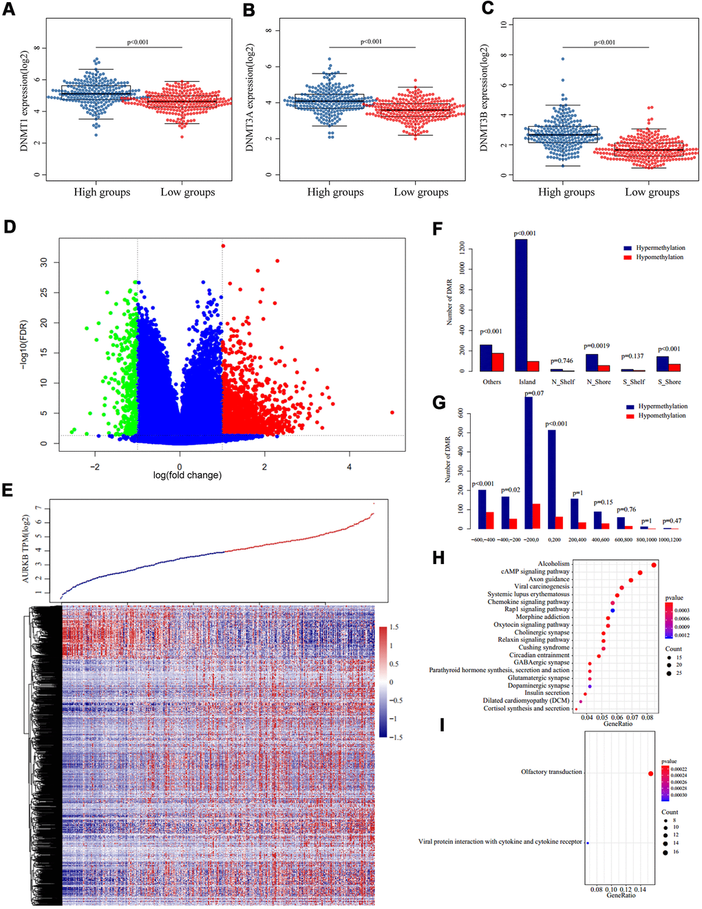 DNA methylation is an important epigenetic mechanism regulating gene expressions through three DNA methyltransferases (DNMT1, DNMT3A, and DNMT3B) and affects cancer cell behaviors. We analyzed differences in the transcription of the three methyltransferases, and as shown in Figure 5A–5C, expressions of the three were significantly higher in AURKBhigh than AURKBlow groups. 476 samples with methylation profiles were included to further examine the methylation differences between the AURKBhigh and AURKBlow groups. Methylation sites were excluded if more than 30% of the samples showed no values or happened to be the cross-reactive CpG sites in the Illumina Infinium Human Methylation 450 microarray. After filling up missing values using the KNN method in the R package ‘impute’, a total of 195,622 methylation sites were obtained and then compared with the R package ‘limma’, according to the thresholds of fold change > 1.3 and FDR < 0.05. The volcano map in Figure 5D showed that the hypermethylation sites were significantly more than hypomethylation sites (1900 and 411, respectively). Heatmap of these differential methylation sites is shown in Figure 5E.