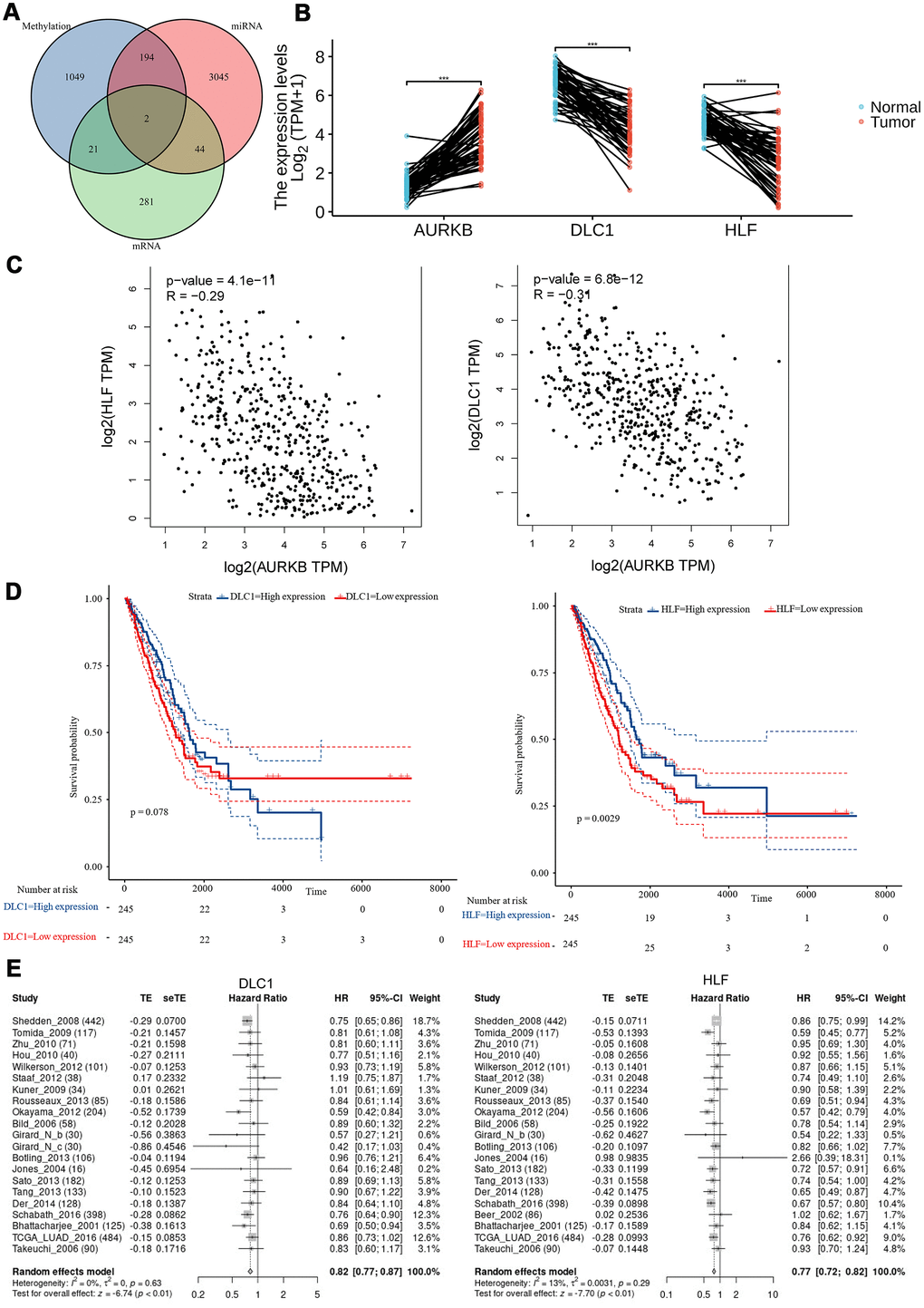 Other epigenetic modifications and methylation changes were also affected by AURKB, as we demonstrated that DNA methyltransferases were remarkably increased in AURKBhigh patients. In our study, hypermethylation, which reflects transcription repression functions, mostly occured within CpG island around TSS [35]. It was possible that those abnormal methylations might accompany the adverse prognosis. Interestingly, in this research, two tumor suppressors (DLC1 and HLF) were both found to be closely correlated with AURKB and AURKB-associated differentially expressed miRNAs and hypermethylation. DLC1 is a tumor suppressor in many different cancer types, including in lung cancer [36, 37] and could inhibit cancer cells through Rho GTPase accelerating proteins (GAP) dependent- and independent-mechanisms [38]. HLF, which is high-expressed in liver tissues but low-expressed lung tissues, is initially identified as a protein related to TCF3 driving acute lymphoblastic leukemia [39], but it is also demonstrated to be robustly hypermethylated in NSCLC when compared to normal tissues [40, 41]. These two genes were closely related to AURKB through methylation modification and miRNA regulation, however, this remained to be validated by our team.