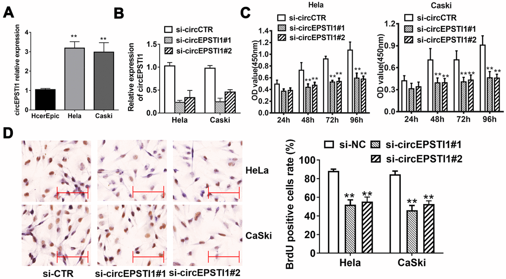We next conducted loss-of-function assays to investigate whether circEPSTI1 was involved in the growth of cervical cancer. RNA interference was utilized to knockdown circEPSTI1 in HeLa and CaSki cervical cancer cell lines to evaluate its potential functions. Two siRNAs were synthesized to knock down circEPSTI1 by targeting the back-splicing region. The expression of circEPSTI1 was decreased after transfected with siRNAs (Figure 1B). Silencing circEPSTI1 suppressed cell proliferation showed by CCK-8 assays (Figure 1C). Furthermore, we used BrdU assay to evaluate proliferative potentiality. BrdU results revealed that thinner nuclear stain dots in the silencing of circEPSTI1 group of both HeLa and CaSki cervical cells than that in the negative control group (Figure 1D).
