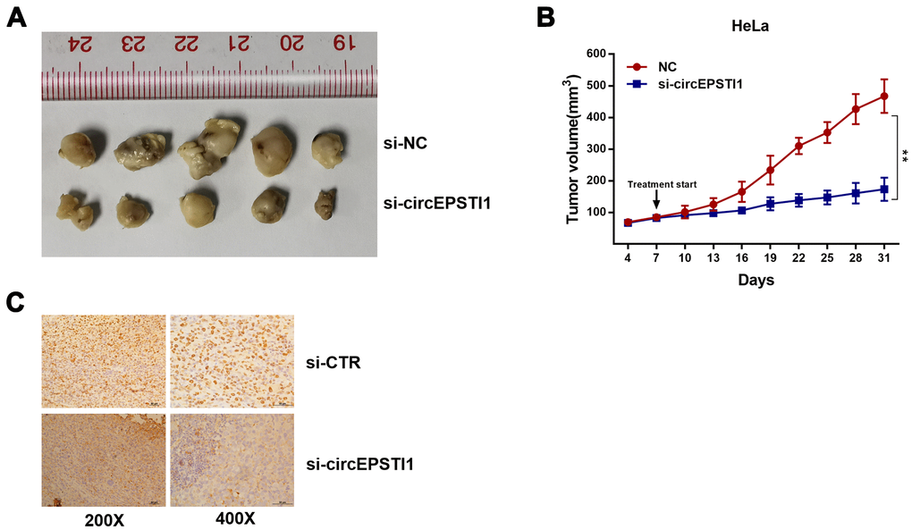 Ethical approval was obtained from the Institute Research Ethics Committee of Sun Yat Sen University Cancer Center (SYSUCC), and all the animal procedures were performed in accordance with institutional guidelines. The 4-week-old female BALB/c nude mice were used for constructing xenograft model. HeLa cells (1×107 cells/mL) were injected into the dorsal flanksusing using 1-mL syringes. Then tumor size was measured and mice received intertumoral injection of si-crEPSTI1-1 (40 μL siRNA1 for cicrEPSTI1) and negative control (40 μL negative control) every four days, respectively (5 mice/group). After 28 days, the mice were sacrificed and xenografts were measured. The tumor volumes (mm3) were calculated: volume = 0.5×(longest diameter)×(shortest diameter)2. The anti-Ki-67 (CST, 1:300) was applied for immunohistochemistry of tumors from each of the mice.