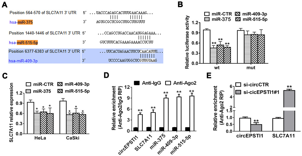 TargetScan online database algorithm was used to predict potential downstream targets of miR-375/409-3P/515-5p and we identified SLC7A11 as the potential oncogene (Figure 4A). Luciferase reporter assays and RIP assays were performed to determine whether miR-375/409-3P/515-5p could interact with the 3’-UTR of SLC7A11 mRNA. Luciferase reporter assays demonstrated that the activity was remarkably decreased after transfection with miR-375/409-3P/515-5p mimics and wildtype 3’-UTR-SLC7A11 reporter in HeLa cells, while was not significantly different after transfection with mutated type 3’-UTR-SLC7A11 reporter vector (Figure 4B). Moreover, the expression of SLC7A11 decreased by miR-375/409-3P/515-5p mimics in HeLa and CaSki cell lines, indicating that SLC7A11 is downregulated by miR-375/409-3P/515-5p (Figure 4C). Additionally, Ago2/IgG related RIP assay revealed that circEPSTI1, SLC7A11 and miR-375/409-3P/515-5p were all significantly enriched to Ago2 in HeLa cells (Figure 4D). Silencing of circEPSTI1 remarkably increased SLC7A11 enrichment to Ago2 (Figure 4E).