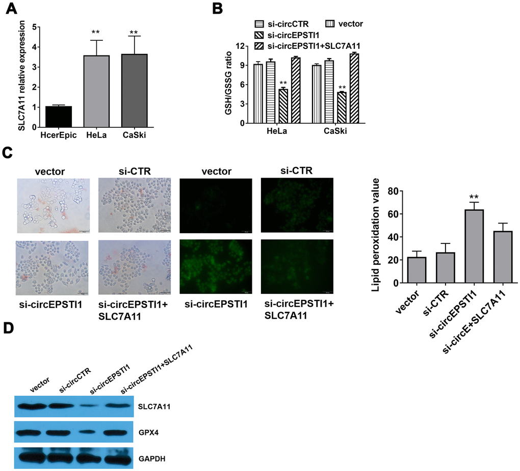 Compared with HcerEpic cell line, the expression level of SLC7A11 were upregulated in HeLa and CaSki cell lines (Figure 5A). Quantitative analysis of total glutathione and reduced glutathione in HeLa cells revealed that silencing of circEPSTI1 would reduce the ratio of GSH/GSSG in cervical cancer cells (Figure 5B). The liperfluo-stained cells were observed by laser confocal for the peroxidation accumulation. Detected by cell morphological analysis, the number of HeLa cells decreased significantly, the refractive index decreased, and the polarization showed a long spindle after inhibiting circEPSTI1. However, the tendency was reversed notably by overexpression of SLC7A11. Moreover, silencing of circEPSTI1 significantly increased the accumulation of lipid peroxides on the cell membrane, while overexpression of SLC7A11 significantly reduced lipid peroxide production (Figure 5C). Western blot analysis was used to quantify the markers of ferroptosis inhibitors SLC7A11 and GPX4 in HeLa cells. After silencing of circEPSTI1, the expressions level of SLC7A11 and GPX4 significantly decreased, which were reversed by overexpression of SLC7A11 (Figure 5D).