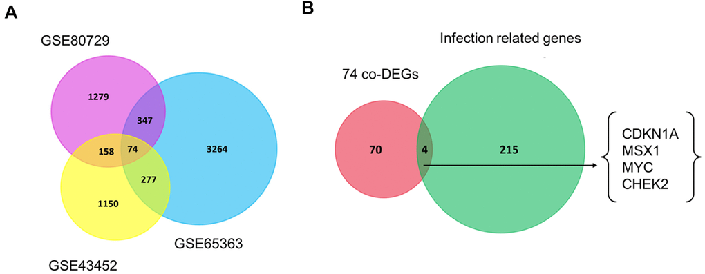 Recently, the development of resistance to TMZ has become a common limitation for successful GBM treatment [20]. To screen the co-DEGs between the untreated group and TMZ-treated group, we analyzed the gene expression profiles from three publicly available datasets regarding TMZ chemotherapy from the GEO platform, namely, GSE43452, GSE65363 and GSE80729. Using the screening criteria of p-value < 0.05, we identified 1659 genes in GSE43452, 3962 genes in GSE65363 and 1858 genes in GSE80729 (Table 1). Next, using the Venn analysis provided by FunRich, 74 genes were found to be significantly codifferentially expressed in all three datasets (Figure 1A, Supplementary Table 1). The co-DEGs from three datasets were presumed to have an impact on the chemotherapy response of GBM.