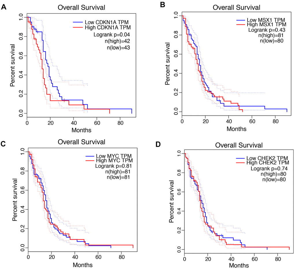 The associations between the expression levels of CDKN1A, MSX1, MYC and CHEK2 and prognosis in GBM patients were analyzed using the GEPIA database. Notably, high CDKN1A expression was marginally associated with poor prognosis in GBM patients (Figure 2A), but the other three genes did not exhibit significant prognostic value (Figure 2B, 2C). Similar findings were identified by the GlioVis database. As shown in Supplementary Figure 1, CDKN1A expression levels significantly impacted prognosis in GBM but MSX1, MYC and CHEK did not have obvious associations with survival in GBM. Based on these results, CDKN1A, as the only gene that showed obvious prognostic significance in GBM, was selected for further study.