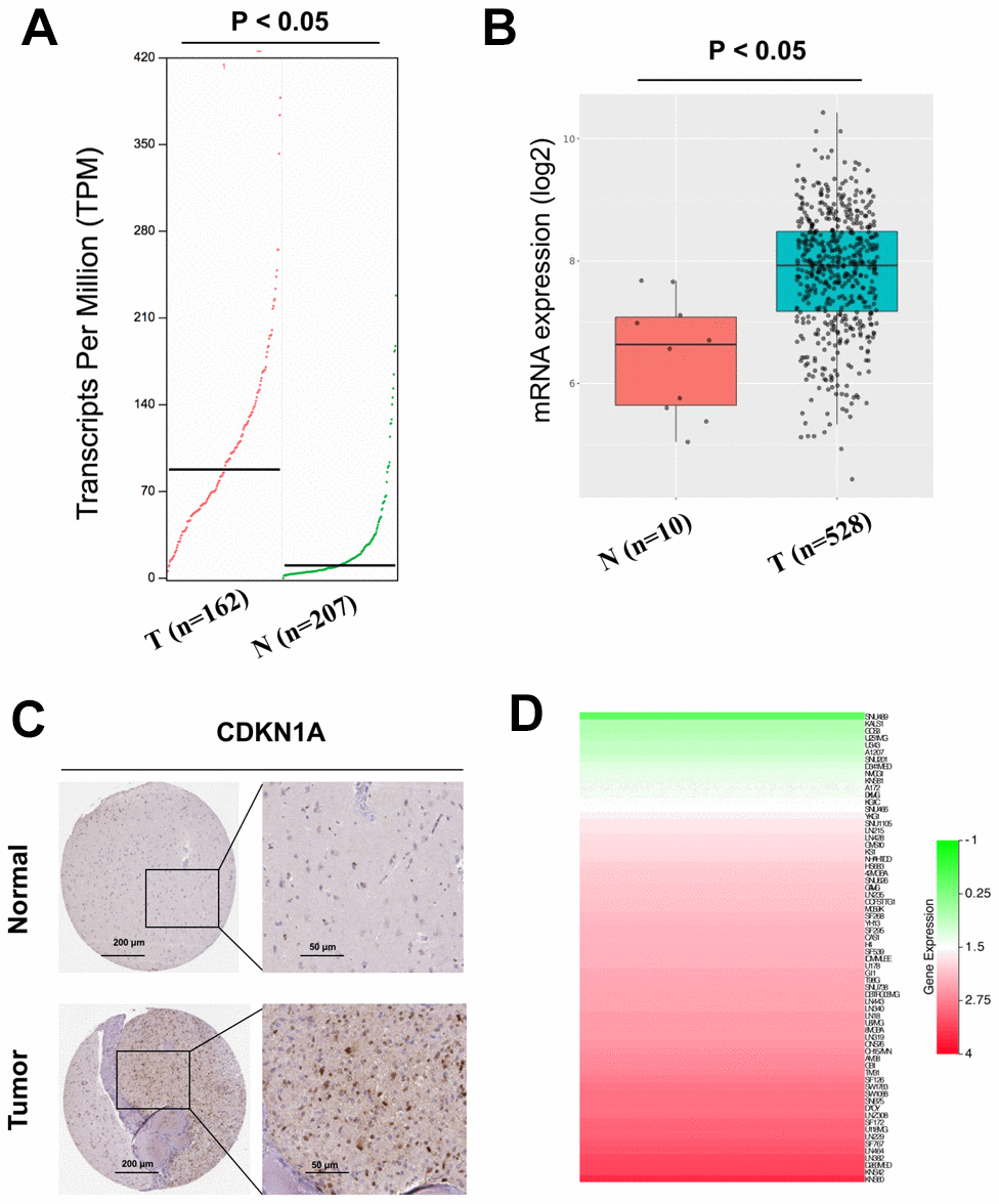 The expression profiles of CDKN1A were analyzed using two independent bioinformatics databases, GEPIA and GlioVis. First, the analysis results from the GEPIA database indicated that CDKN1A mRNA expression was higher in GBM tissues than that in noncancerous tissues (Figure 3A). Next, data from the GlioVis database revealed that CDKN1A mRNA expression levels were significantly upregulated in GBM tissues (Figure 3B), which was consistent with those obtained using the GEPIA database. Both databases demonstrated that CDKN1A mRNA expression levels were upregulated in GBM tissues. Meanwhile, we evaluated the protein expression levels of CDKN1A in GBM patients by analyzing the immunohistochemical data from the Human Protein Atlas. As shown in Figure 3C, significantly elevated levels of CDKN1A was found in the glioma tissues. Further analysis using the CCLE database to study CDKN1A expression profiles in GBM cell lines and the heatmap revealed elevated CDKN1A expression levels in most GBM cell lines (Figure 3D).