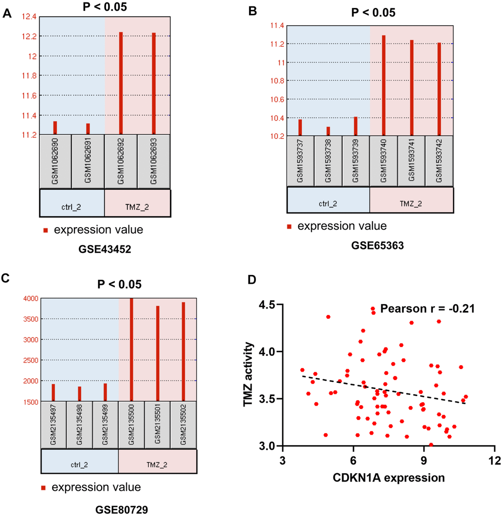To further determine the effect of CDKN1A on the treatment outcomes of GBM patients, we checked the expression level of CDKN1A in three microarray datasets related to TMZ chemotherapy. The data from these three datasets, GSE43452, GSE65363 and GSE80729, all showed that treatment with the anticancer agent TMZ clearly upregulated CDKN1A expression in human GBM cells (Figure 4A–4C). In addition, the expression levels of CDKN1A might be negative correlation with TMZ activity in 79 glioma cells from CellMinerCDB [23] (Figure 4D, Supplementary Table 4).