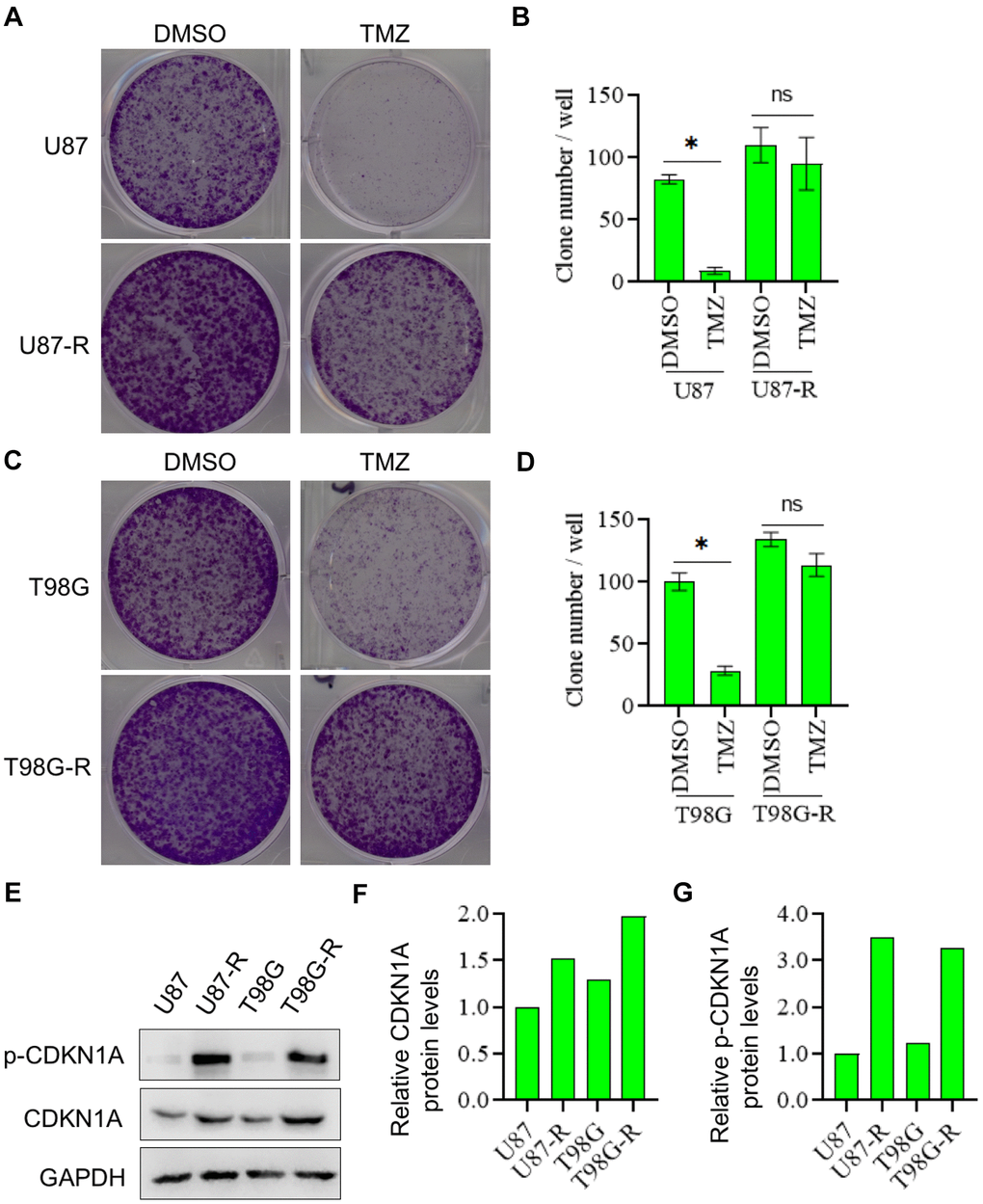 To verify the promoting effect of CDKN1A on cell chemoresistance, we detect CDKN1A expression in TMZ-resistant glioma cell lines (U87-R and T98G-R cells) and their parental cell lines (U87 and T98G cells). First, using the colony formation assay, we proved that U87-R and T98G-R cells were indeed significantly more resistant to the therapy of TMZ compared with U87 and T98G cells, respectively (Figure 5A–5D). After this, CDKN1A and p-CDKN1A expression was further found to be higher in U87-R and T98G-R cells compared with that in U87 and T98G cells, respectively (Figure 5E–5G). These data thus suggested that CDKN1A may played a critical role in TMZ resistance of GBM cells.