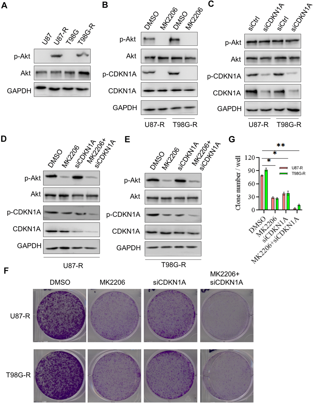 Studies have shown that AKT signaling pathway plays an important role in chemoresistance of GBM [24]. Thus, we then investigated whether the effect of CDKN1A on cell chemoresistance was associated with AKT activity. Western blot analysis showed that the expression of p-AKT, a constitutively active form of AKT, was significantly higher in TMZ-resistant glioma cells compared with that in their parental cells, whereas the expression of total AKT has no change, indicating that AKT played a critical role in chemoresistance of GBM (Figure 6A). We then treated TMZ-resistant glioma cells with the specific inhibitor to AKT, MK2206, and found that MK2206 treatment significantly suppressed phosphorylation of CDKN1A at Ser473 (Figure 6B). However, the down-regulated expression of CDKN1A had no effect on AKT expression in TMZ-resistant glioma cells, suggesting that CDKN1A was a downstream regulatory molecule of AKT (Figure 6C). Next, we treated TMZ-resistant glioma cells with both MK2206 and siCDKN1A, as shown in Figure 6D, 6E, the inhibitory effect on p-CDKN1A expression was remarkably increased by combinational treatment. We performed a colony formation assay and observed that TMZ-resistant glioma cells treated with both MK2206 and siCDKN1A had a significantly lower number of colony formation compared with the control group and either of the individual treatment groups (Figure 6F, 6G). The above results indicated that CDKN1A was involved in AKT-mediated TMZ resistance of glioma cells.