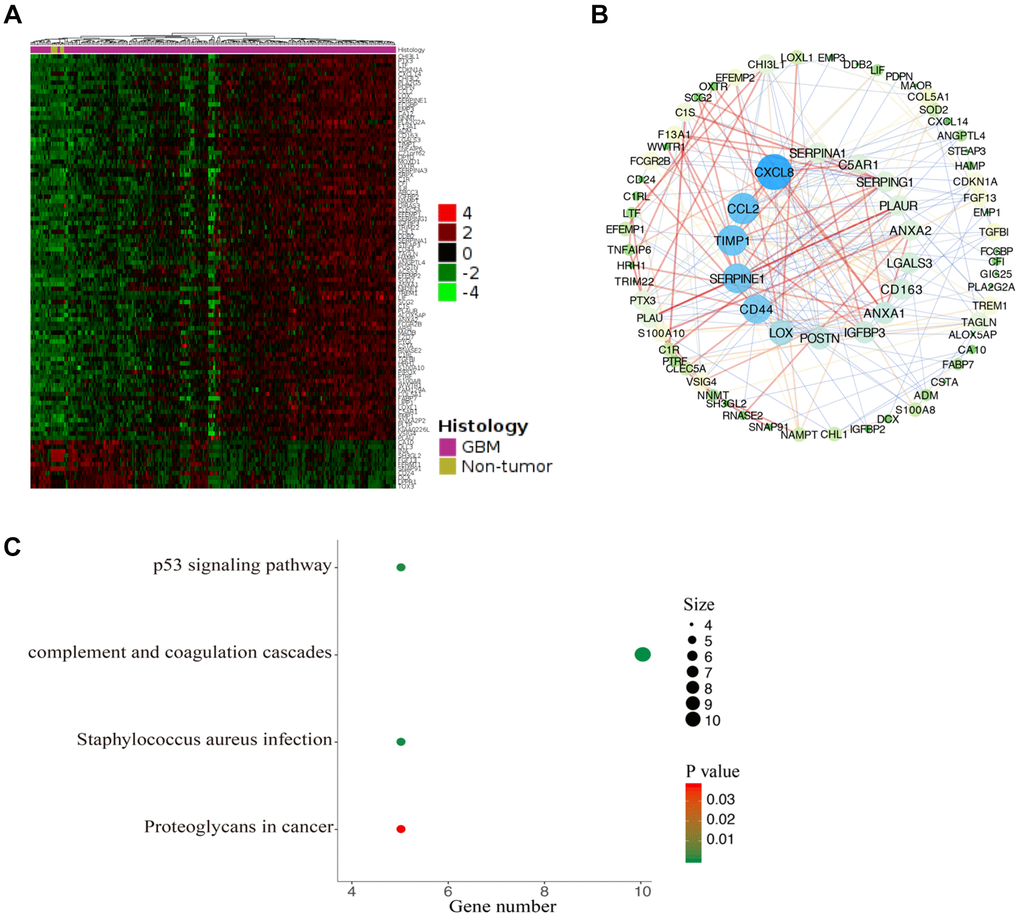 To further understand the potential role of CDKN1A in GBM development, we performed functional enrichment annotation analysis of its coexpressed genes. We extracted the datasets (TCGA-GBM) from TCGA to screen DEGs that interact with CDKN1A from the GlioVis database. As shown in Figure 7A and Supplementary Table 3, 99 genes were acquired using screening criteria of |LogFC| ≥1.3 and P≤0.05. Then, a PPI network of the genes that coexpressed with CDKN1A was created with the STRING database and Cytoscape software (Figure 7B). To further understand the biological functions of these coexpressed genes, KEGG pathway analyses were conducted by using the DAVID database. The results showed that these coexpressed genes were functionally enriched in several pathways which were mostly those involving complement and coagulation cascades (Figure 7C).