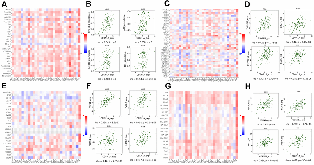Guglietta S et al. reported that the complement and coagulation cascade pathways were associated with protumorigenic phenotypes of immune cells and protection of tumor cells from immune attack which ultimately favor the development and metastasis of tumors [25]. Therefore, we investigated the associations between CDKN1A expression and lymphocytes and immunomodulators using the TISIDB database. Figure 8A shows the positive correlation between CDKN1A expression and tumor-infiltrating lymphocytes (TILs) in GBM patients. Additionally, the lymphocytes that exhibited the most significant correlations included central memory CD4 T cells (Tcm_CD4, Spearman: ρ= 0.543), plasmacytoid dendritic cells (pDC, Spearman: ρ= 0.508), activated dendritic cells (Act_DC, Spearman: ρ= 0.508) and type-1 T helper cells (Th1, Spearman: ρ= 0.454) (Figure 8B). Immunomodulators have been classified into three types of molecules which include immunoinhibitors, immunostimulators and major histocompatibility complex (MHC) molecules. Figure 8C shows the correlation between CDKN1A expression and immunostimulators; the immunostimulators displaying the most significant correlations included TNFSF13 (Spearman: ρ= 0.429), CD276 (Spearman: ρ= 0.420), TNFRSF14 (Spearman: ρ= 0.420) and CD86 (Spearman: ρ= 0.351) (Figure 8D). Figure 8E shows the correlations between CDKN1A expression and immunoinhibitors; those immunoinhibitors displaying the most significant correlations included TGFB1 (Spearman: ρ= 0.498), PVRL2 (Spearman: ρ= 0.451), CD274 (Spearman: ρ= 0.420) and IL10RB (Spearman: ρ= 0.417) (Figure 8F). Figure 8G shows the correlations between CDKN1A expression and MHC molecules; the MHC molecules that showed the most significant correlations included HLA-A (Spearman: ρ= 0.507), HLA-B (Spearman: ρ= 0.488), TAP1 (Spearman: ρ= 0.438), and TAPBP (Spearman: ρ= 0.437) (Figure 8H). We speculate that since CDKN1A was significantly correlated with various types of tumor-infiltrating lymphocytes, immunoinhibitors, immunostimulators and MHC molecules in GBM, it might exert a more significant effect on immune fingerprinting in GBM.