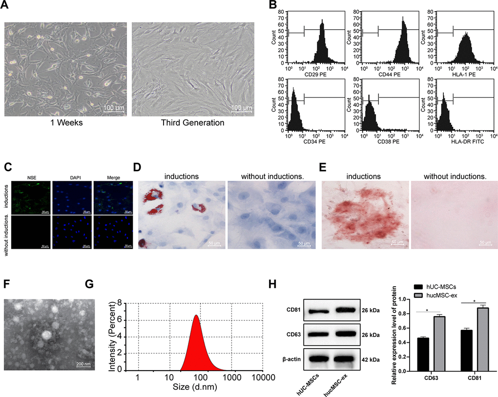 Fresh human umbilical cords from parturient women after cesarean delivery in the Second Affiliated Hospital of Harbin Medical University were collected for this study. The umbilical cords were immersed in fetal bovine serum (FBS) (Thermo Fisher Scientific, Waltham, MA, USA) supplemented with 1% streptomycin and penicillin. Excess blood was removed. hUCMSCs were extracted using trypsin detachment and incubated at 37° C with 5% CO2. When cells reached approximately 80% confluence, hUCMSCs were passaged. Cell morphology was observed under optical microscope (Olympus, Tokyo, Japan). Flow cytometry was used to detect hUCMSCs surface markers CD29, CD44, HLA-I, CD34, CD38 and HLA-DR. The neurogenic induction of hUCMSCs was observed by immunofluorescence staining. The adipogenic differentiation was evaluated using oil red O staining. Osteogenic differentiation was assessed using alizarin red staining. Osteogenic and adipogenic induction reagents were purchased from Gibco (Grand Island, NY, USA). Neurogenic induction reagent was purchased with Shanghai Ricky Bio Technology Co., Ltd (Shanghai, China). Each induction process was carried out in strict accordance with the instructions of the kit.
