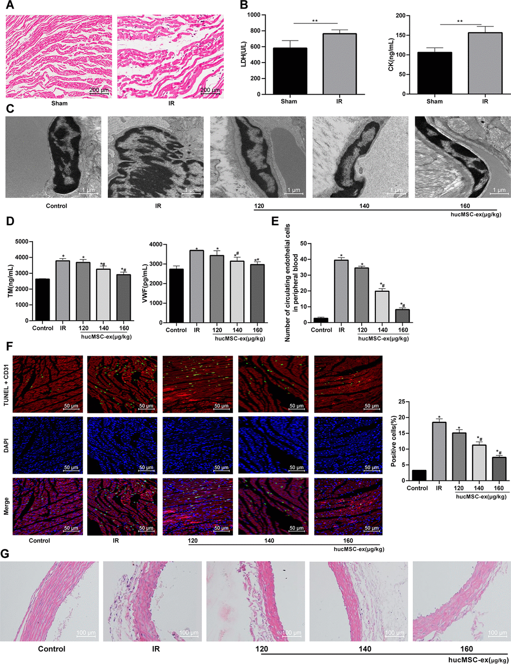 I/R rat models were injected with different concentrations of hUCMSC-ex. TEM showed enlarged nuclei of endothelial cells from I/R rats, with finger-like membrane protruding into the lumen. With the concentrations of hUCMSC-ex increased, the ultrastructure of rat CMECs was gradually improved (Figure 3C). Additionally, vWF and TM are two markers reflecting the degree of vascular endothelial injury. To determine the injury of myocardial endothelium in each group, vWF and TM levels were measured. TM and vWF levels in sera were significantly increased in I/R rats, both of which were gradually lowered by the increased concentrations of hUCMSC-ex (all p < 0.05) (Figure 3D). Flow cytometry indicated that the number of CECs was significantly increased in I/R rats, but decreased gradually and vascular endothelial injury was alleviated with the increase concentrations of hUCMSC-ex (both p < 0.05) (Figure 3E). Then, in order to evaluate the apoptosis of CMECs in each group, we carried out immunofluorescence double staining, using CD31 (red) to label CMECs, TUNEL (green) to label apoptotic cells. Compared with the controls, the CD31 + TUNEL positive signal of CMECs in I/R rats was increased significantly, which was gradually decreased with the addition of hUCMSC-ex (Figure 3F). HE staining showed disordered arterial intima structure, endothelium convex and defect in the I/R rats, and the structure, thickness and intima integrity of the thoracic aorta were improved to some degrees with the addition of hUCMSC-ex (Figure 3G).