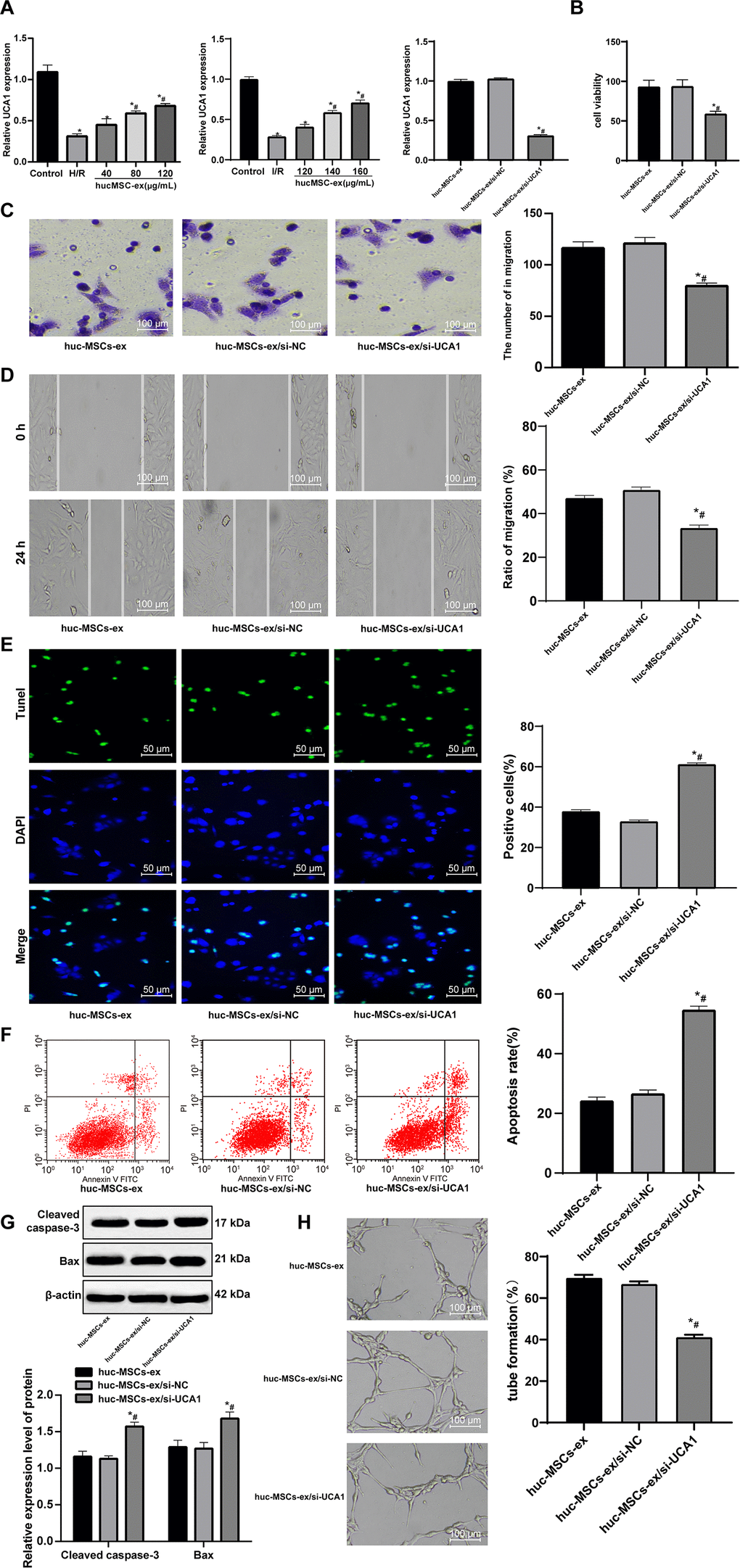 Recently, exosomes are emerged as vehicles to deliver lncRNAs to recipient cells [18]. LncRNA UCA1 is protective against myocardial cell injury induced by anoxia and glucose deficiency [19]. In light of these, we speculated that hUCMSC-ex might play a protective role in H/R injury of CMECs by delivering lncRNA UCA1. To verify this idea, we used RT-qPCR to detect the expression of lncRNA UCA1 in cardiomyocytes and myocardial tissues. Compared with the controls, after H/R injury, the expression of lncRNA UCA1 in cardiomyocytes and myocardial tissues decreased significantly. With the increasing concentrations of hUCMSC-ex, the expression of lncRNA UCA1 increased gradually. It can be seen that the exosomes released lncRNA UCA1 into cells. To verify that exosomes are protective by releasing lncRNA UCA1, we successfully interfered with the expression of UCA1 (Figure 5A) in hUCMSCs, and extracted the exosomes for in vitro experiments. CCK-8, Transwell, scratch, TUNEL, flow cytometry, Western blot and tubule formation assays were used to evaluate the biological episodes of cardiomyocytes. The results showed that the protective effect of hUCMSC-ex/si-UCA1 on CMEC H/R injury was weakened (all p < 0.05) (Figure 5B–5H).
