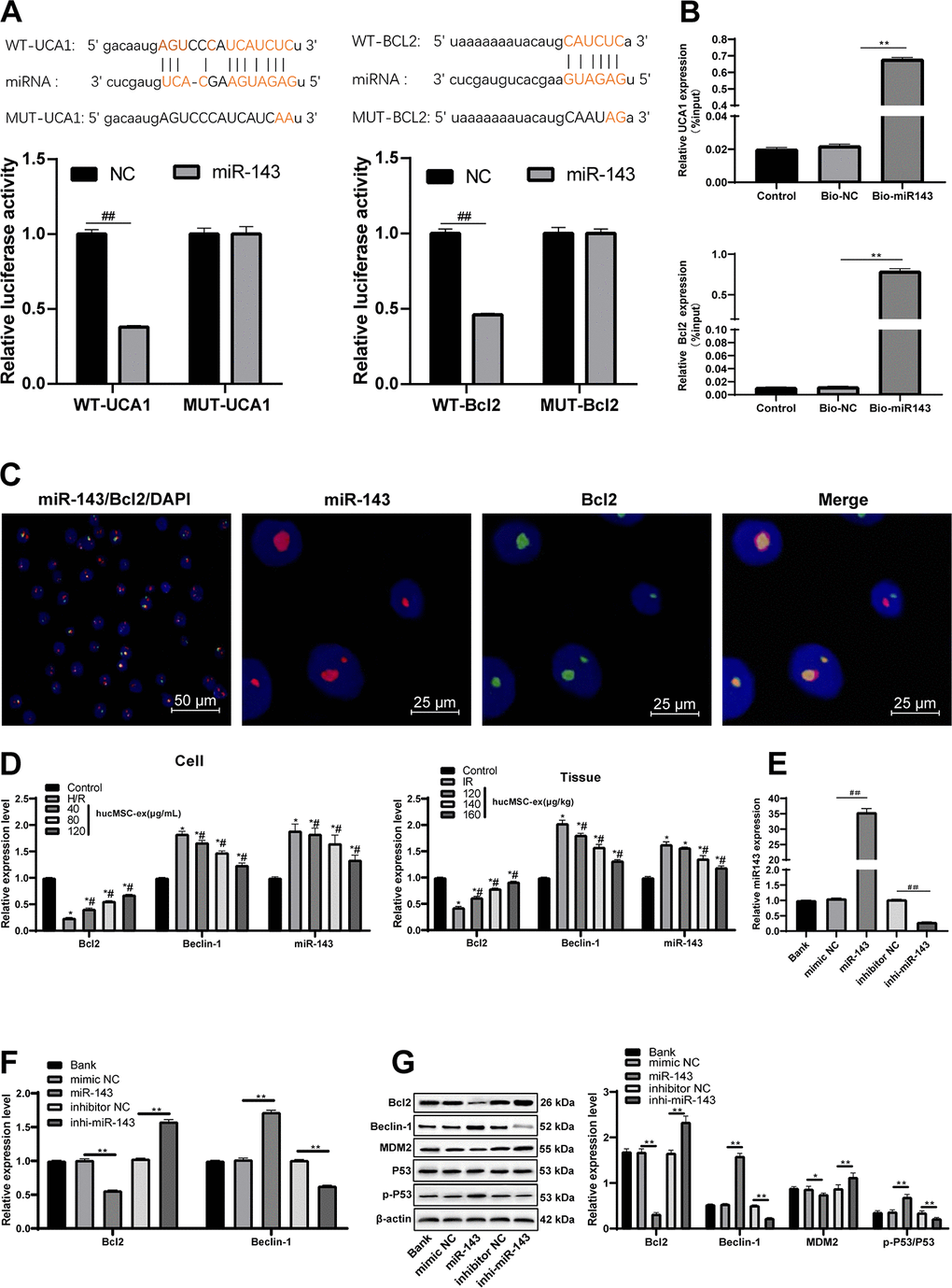 As previously reported, lncRNA UCA1 controls mRNA degradation by RNA-RNA competitive interactions [20]. Atorvastatin inhibits miR-143 expression to exert protection against oxidative stress in cardiomyocytes [21]. Therefore, we speculated that lncRNA UCA1 might also protect against H/R injury in cardiomyocytes by binding to miR-143. The binding relationship between lncRNA UCA1 and miR-143 was predicted through the biological website (https://web.archive.org/web/20110222111721/http://starbase.sysu.edu.cn/), and further verified by dual luciferase reporter gene assay and RNA pull-down experiment (Figure 6B). However, the downstream mechanism of miR-143 was unknown. Increasing the expression of Bcl-2 and decreasing the expression of Beclin1 protect against I/R injury [22]. Therefore, we speculate that Bcl-2 and Beclin1 may interact with miR-143. It was predicted a binding relationship between miR-143 and Bcl-2 by the biological website. Then, the binding relationship was further verified by dual luciferase reporter gene assay, RNA pull-down and two-color fluorescence in-situ hybridization (Figure 6A–6C). The expression of lncRNA UCA1 and Bcl-2 was upregulated with the increase concentrations of hUCMSC-ex, while miR-143 and Beclin-1 expression was downregulated (all p < 0.05) (Figure 6D). After transfection with miR-143 mimic, the expression of miR-143 and Beclin-1 was upregulated, and Bcl-2 was downregulated, opposite to the changes caused by miR-143 inhibitor transfection (Figure 6E). The results suggested that hUCMSC-ex transmits lncRNA UCA1 to CMECs to competitively bind miR-143 to reduce the targeting inhibition of miR-143 on Bcl2. In addition, it is reported that lncRNA UCA1 can protect cardiomyocytes from apoptosis induced by H/R by inhibiting miR-143 and regulating downstream MDM2/p53/BCL2 signaling pathway [14]. Therefore, Western blot was used to detect the levels of MDM2/p53 pathway related proteins. After overexpression of miR-143, the level of p-p53/p53 was upregulated, and the level of MDM2 was downregulated, while the low expression of miR-143 showed the opposite trends (all p < 0.05) (Figure 6F–6G). However, after intervention of miR-143, BCL2 showed more significant changes compared with the levels of MDM2/p53 pathway related proteins. In conclusion, UCA1 transferred by hUCMSC-ex as sponge adsorbed miR-143, and then regulated the expression of BCL2 to protect CMECs from H/R injury.