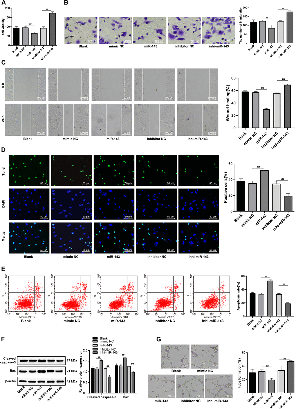 After overexpression of miR-143, the viability, invasion and migration of H/R-injured CMECs were dramatically decreased (all p < 0.05), all of which were enhanced by inhibition of miR-143 (Figure 7A–7C). In addition, TUNEL-positive CMECs and apoptosis rate, levels of Cleaved caspase3 and Bax were increased remarkably, and the lumen formation was inhibited by overexpression of miR-143 (all p < 0.05) (Figure 7D–7G), opposite to the changes in those caused by inhibition of miR-143. In summary, miR-143 overexpression deteriorates H/R injury in CMECs.