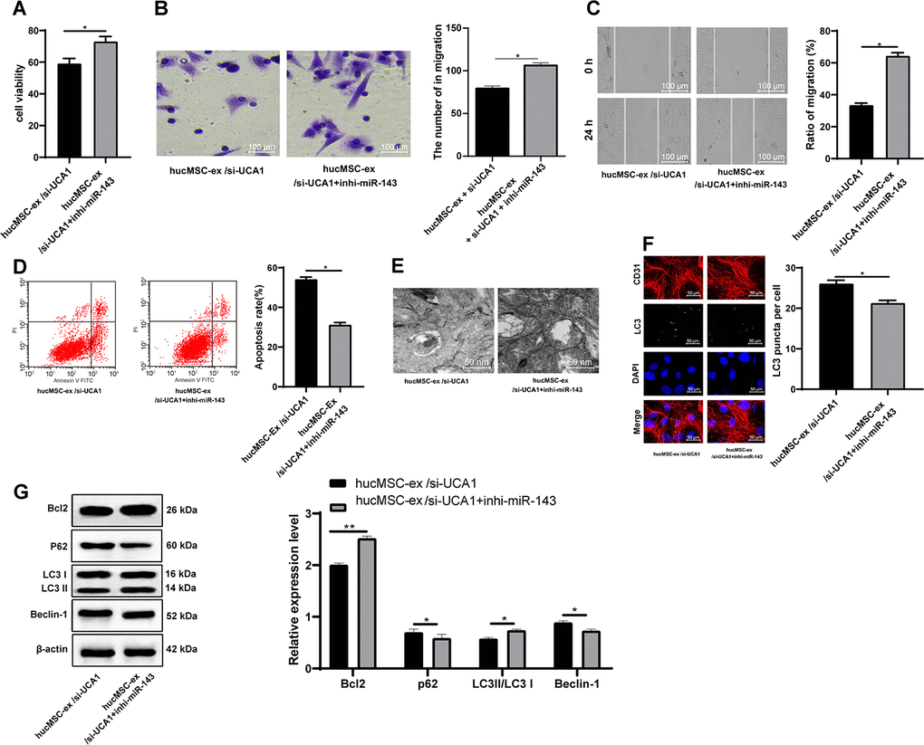 To further confirm the role of lncRNA UCA1 through the adsorption of miR-143, we carried out a functional rescue experiment, by setting up the cell group of exosomes after interfering with lncRNA UCA1 (hUCMSCs-ex/si-UCA1), and the combined group of hUCMSCs-ex/si-UCA1 and low expression miR-143 (hUCMSCs-ex/si-UCA1 + inhi-miR-143). Compared with the hUCMSCs-ex/si-UCA1 treatment, hUCMSCs- ex/si-UCA1 + inhi-miR-143 treatment elevated the viability, invasion and migration of H/R-injured CMECs, reduced apoptotic rate and autophagosomes, LC3 fluorescence, LC3-II/LC3-I and Beclin-1 protein levels and increased p62 protein level (all p < 0.05) (Figure 8A–8G).